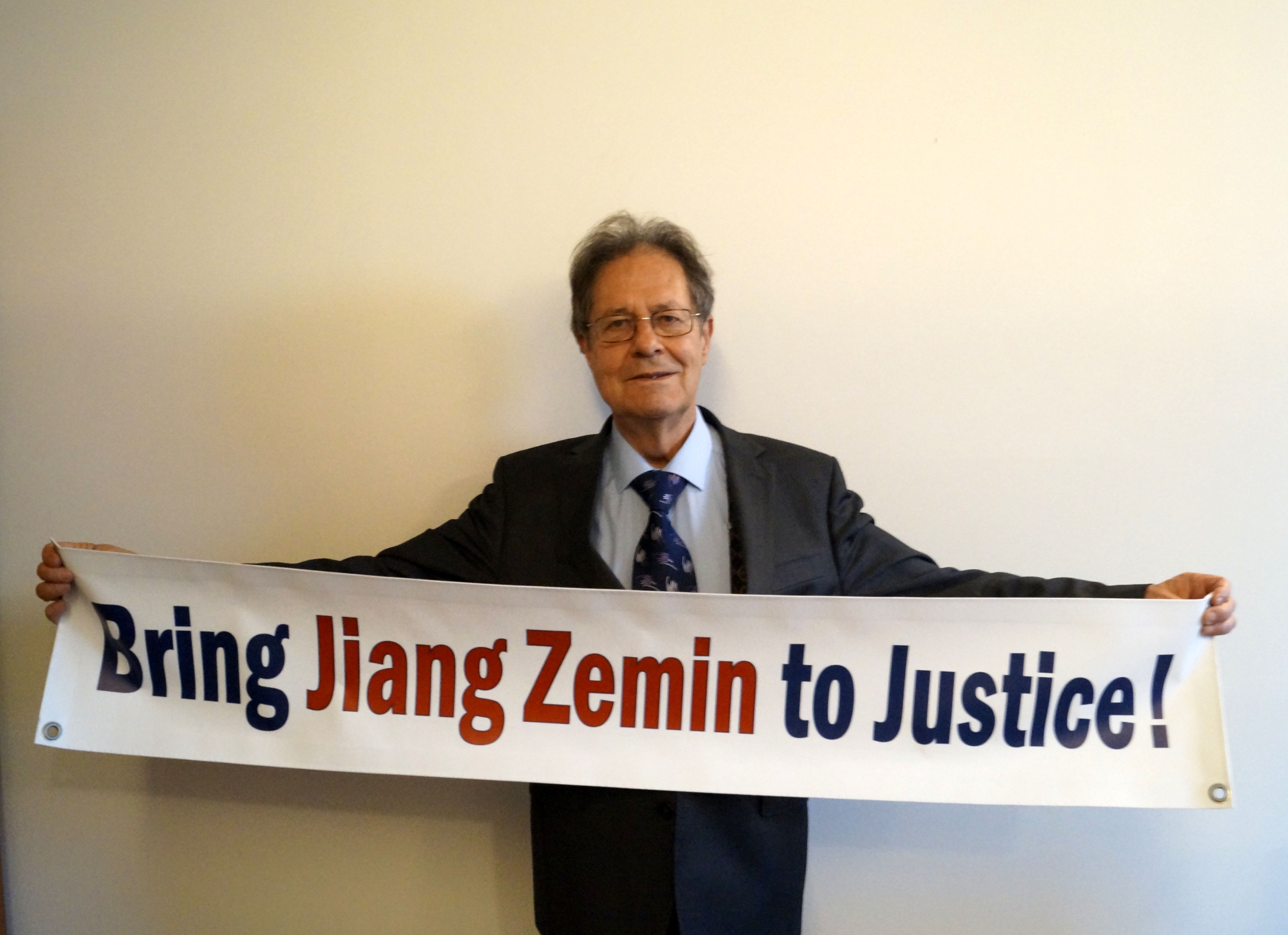![]() 欧洲议会议员克劳斯•布赫纳教授(Prof. Dr. Klaus Buchner)手举 “法办江泽民!”的横幅 |