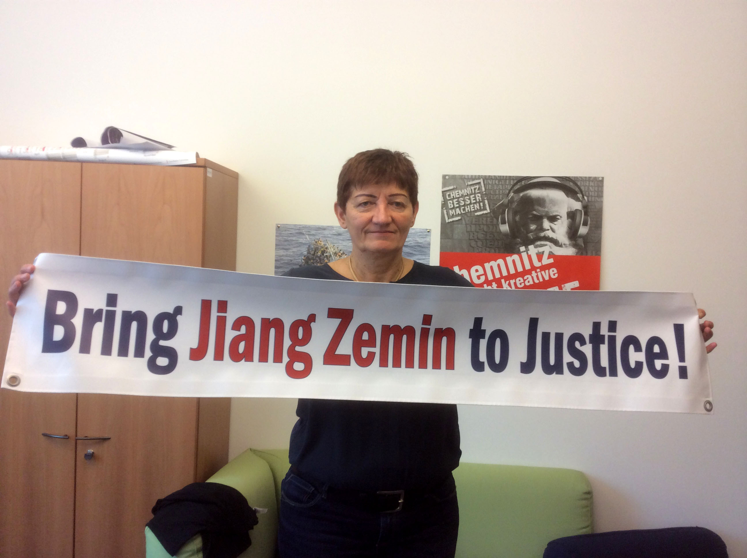 ![]() 欧洲议会议员科妮莉亚•恩斯特博士(Dr. Cornelia Ernst)手举“法办江泽民!”的横幅 |