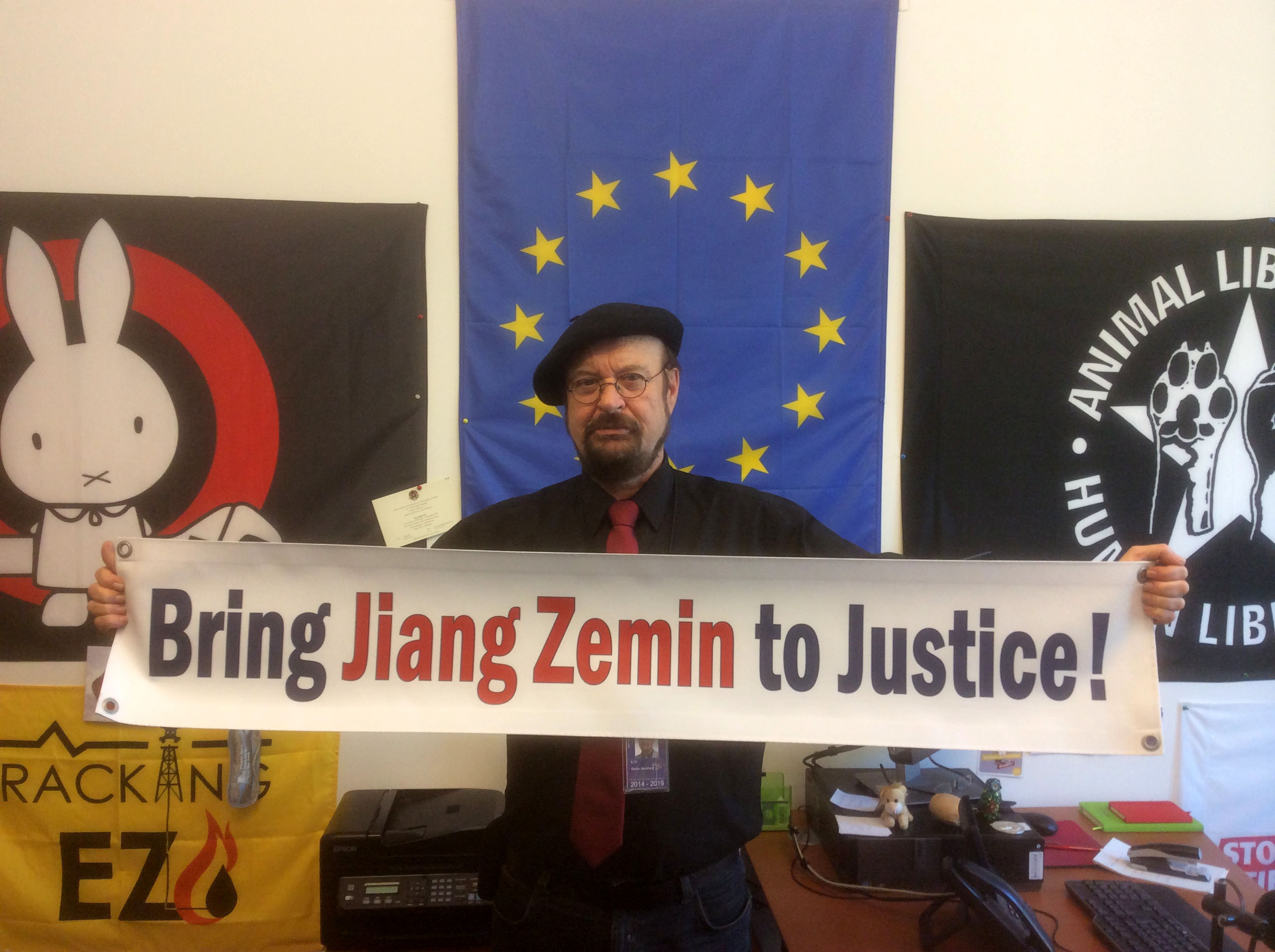 ![]() 欧洲议会议员斯蒂芬•埃克先生(Stefan Eck)手举“法办江泽民!”的横幅 |
