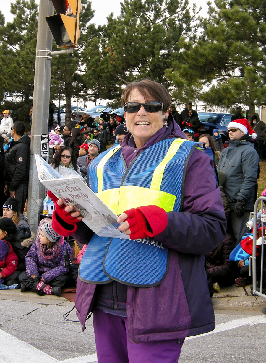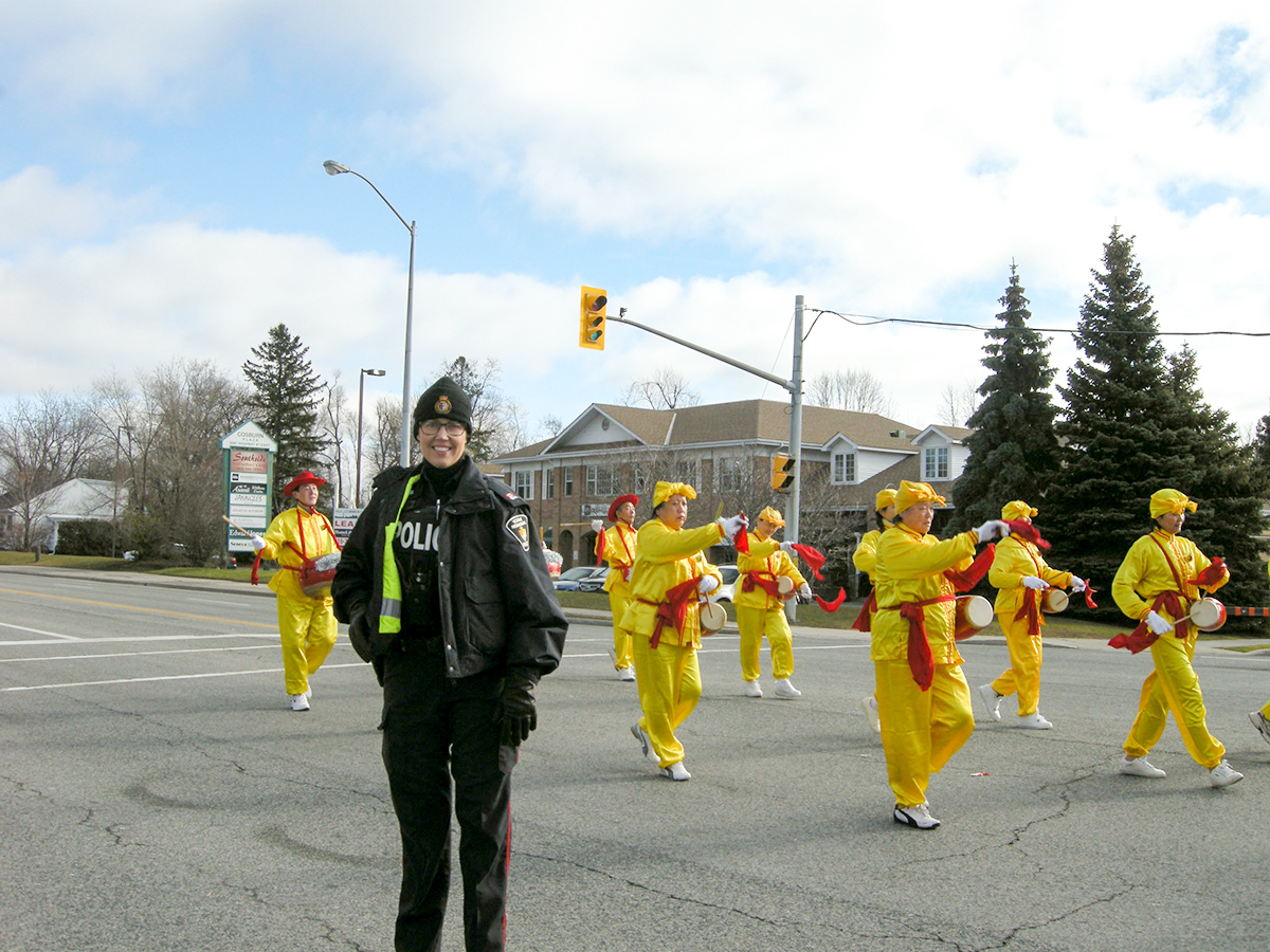 Denise Cartier警官来自于约克区域万锦市警察局,今天在万锦市圣诞大游行现场执勤。Cartier警官说:“天国乐团的演奏很精彩,音乐很优美!”天国乐团走过去之后,紧接着是腰鼓队,Cartier警官说:“腰鼓队的服装美极了,她们衣服的颜色很鲜亮(colorful)!”