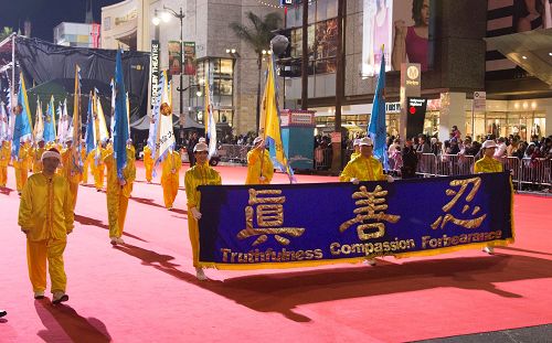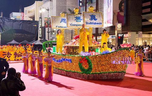 法轮功学员的游行队伍自二零零五年首次亮相好莱坞大游行,备受瞩目。穿着中国古装的天国乐团响亮的演奏振奋人心,美丽的花车上法轮功学员祥和的功法表演,手拿琵琶、翩翩起舞的仙女,旗队与腰鼓队表演为好莱坞带来浓浓的东方韵味。