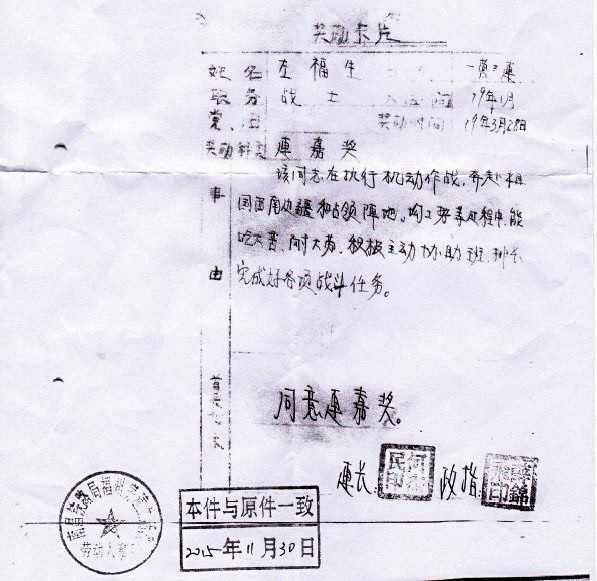 ![]() 图:左福生一九七九年“对越自卫反击战”中获得连嘉奖 |