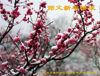 朵朵红梅雪中开,跟着师尊志不改。助师正法无所惧,救度众生不懈怠。佳节来临祝师尊,新年快乐新年好。