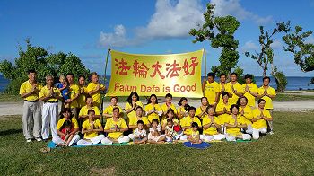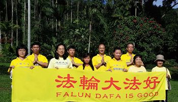 女游客掏出一包大枣、核桃仁,塞到法轮功学员手里说:这是祖国的,你那么爱国,爱我们同胞,你得收下。见法轮功学员推辞,她说:“你们真是好人,我都不知道怎么感谢你们,就给我这个面子吧。”法轮功学员收下礼物,从自己兜里掏出块巧克力回赠给她。她高兴地接过去掰开,分给周围做了三退的游客吃。一群人高兴地向法轮功学员道谢。