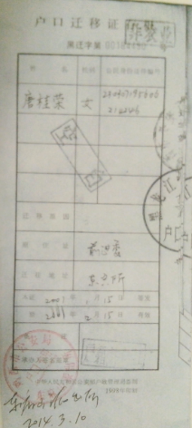 显然,此户口迁移证(内容)虚假: 一、二零零一年一月十五日,唐桂荣正被关押在鸡西市第二看守所(后被投入劳教所),没出来把唐桂荣的户口迁到滴道区东兴派出所;二、迁移证没写明迁入地是哪个公安局或公安分局的东兴所;三、没有迁入地滴道区东兴派出所准许迁入的公文;四、没有唐桂荣签字的其它文书表格等印证,也没有其它证据佐证; 五、此户口迁移证纸张非常白亮并字迹鲜艳乌黑,显然是新纸张新字迹,纸张毫无黄色,严重违反十三年纸张必然呈现黄色自然规律;六、迁移证写明十八位的唐桂荣居民身份证编码是二零零四年元旦公安部才决定启用的第二代十八位数字身份证编码,而不是二零零一年当时适用的第一代十五位身份证编码,违背事实,没有客观真实性,显然是故意伪造国家公文!