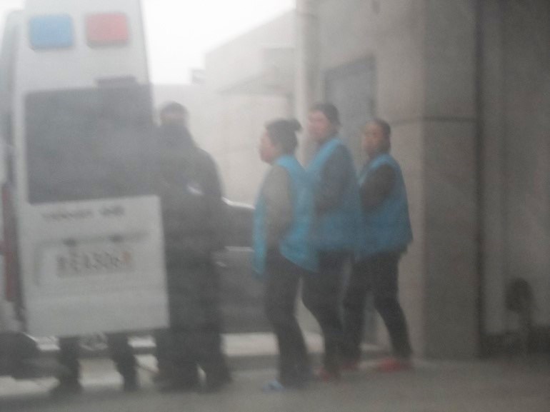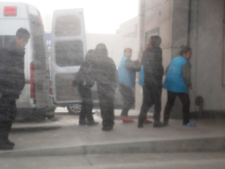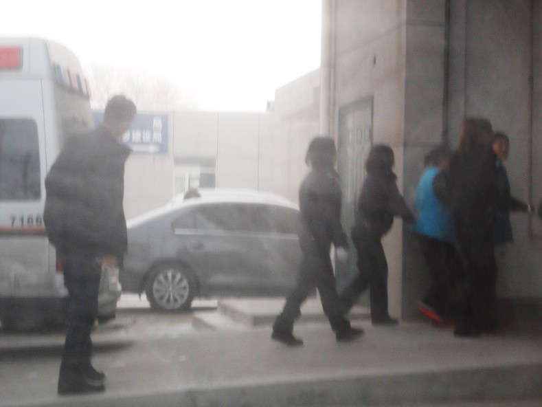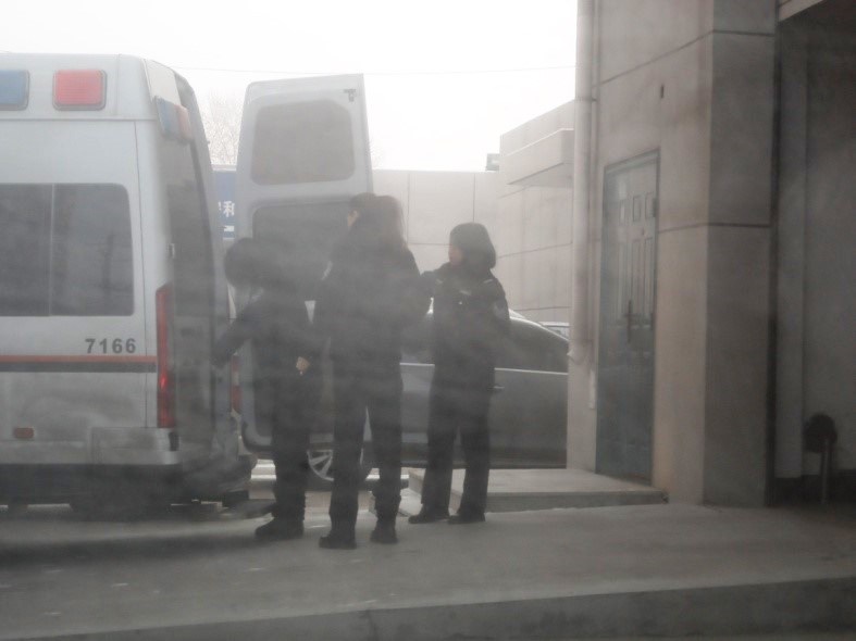 图二:俩位大法弟子(穿红拖鞋)下警车、进法院