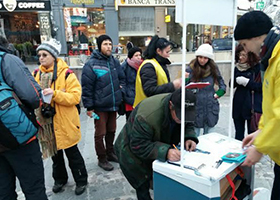 法轮功学员在罗马尼亚首都布加勒斯特市中心设立真相点,向游人展示优美舒缓的法轮功功法,揭露中共残酷迫害法轮功修炼者的罪行。