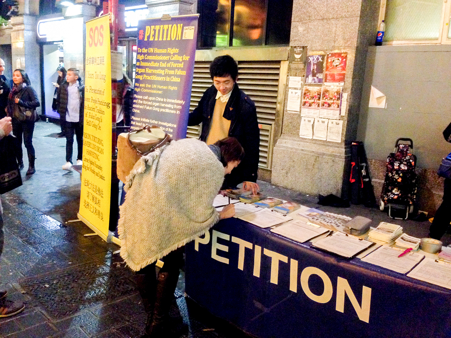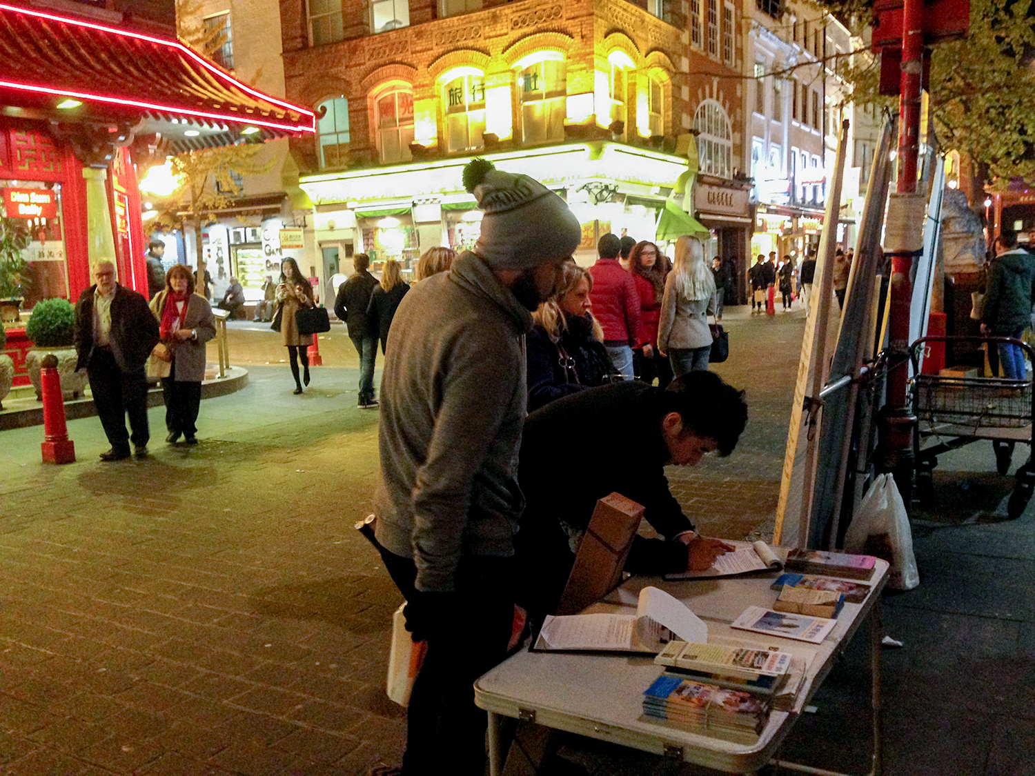 图1:法轮功学员在伦敦唐人街设立真相点,传播真相。