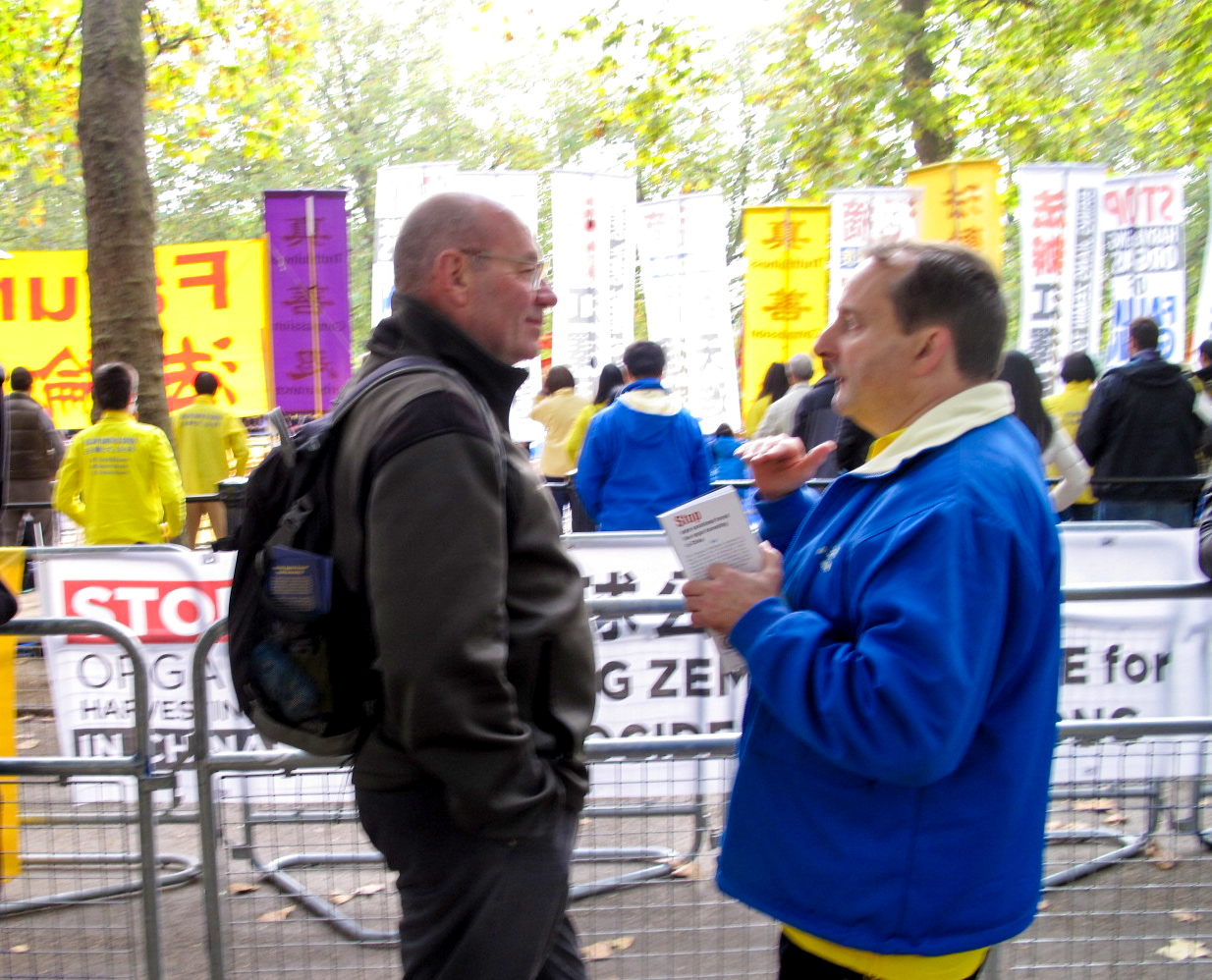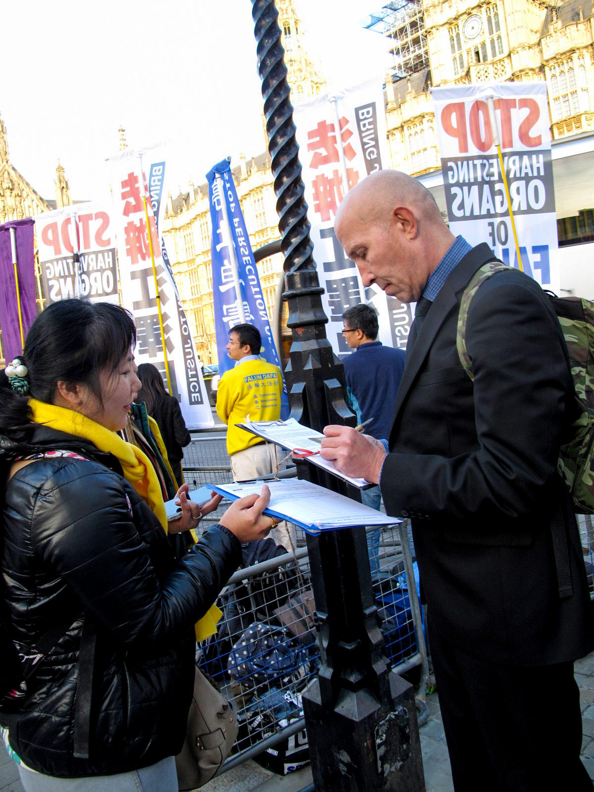 英国人保罗(Paul)是住在伦敦的一位从事摄影和平面设计的自由职业者,二零一五年十月二十日下午,他在英国议会大厦外遇到正在和平抗议的法轮功学员,其时访英的习近平正在对面的英议会大厦内出席活动。保罗停下脚步与法轮功学员交谈,一开始他只是带着愤愤不平的情绪对英国政府为了经济利益牺牲本国人利益的做法表示不满,但当法轮功学员提醒他英国政府拿人权与中共做交易很危险、中共对法轮功学员的残酷迫害甚至活摘器官是反人类罪时,保罗立即对法轮功学员在英议会大厦前的和平发声表示理解、赞赏和支持,并签字谴责中共活摘罪恶。