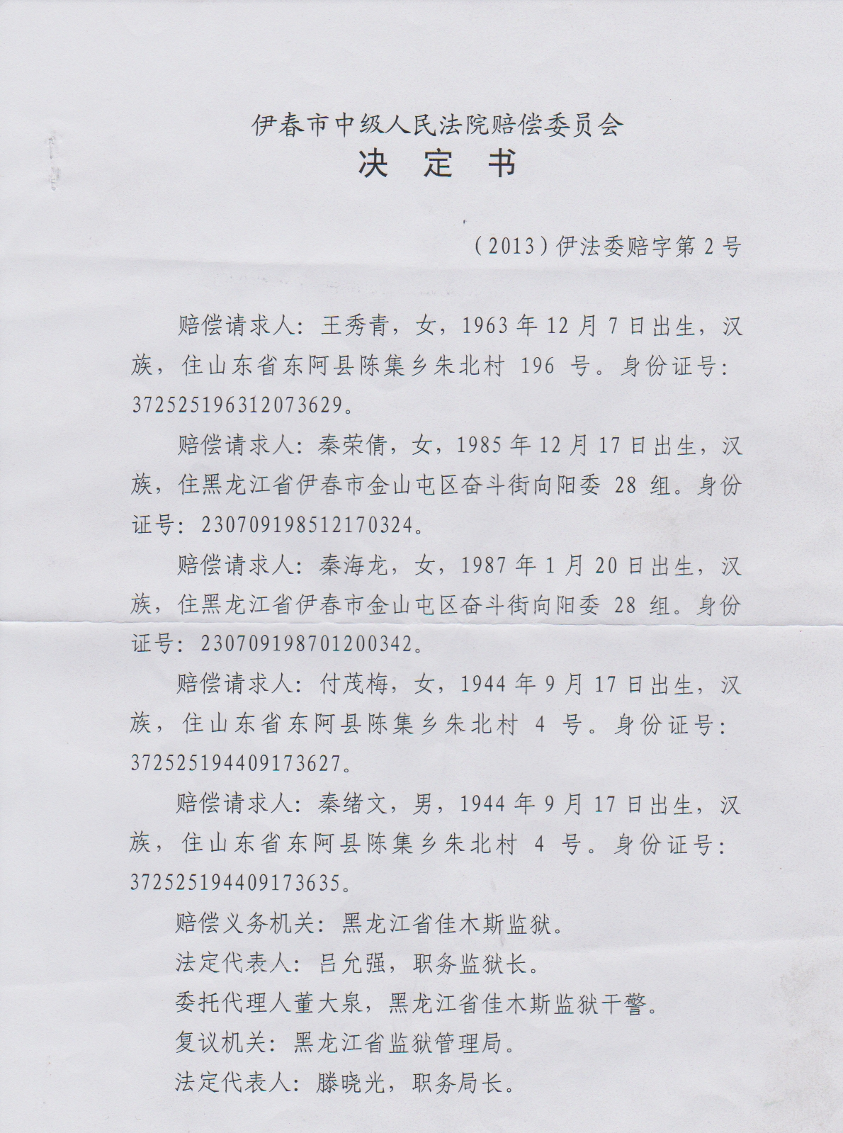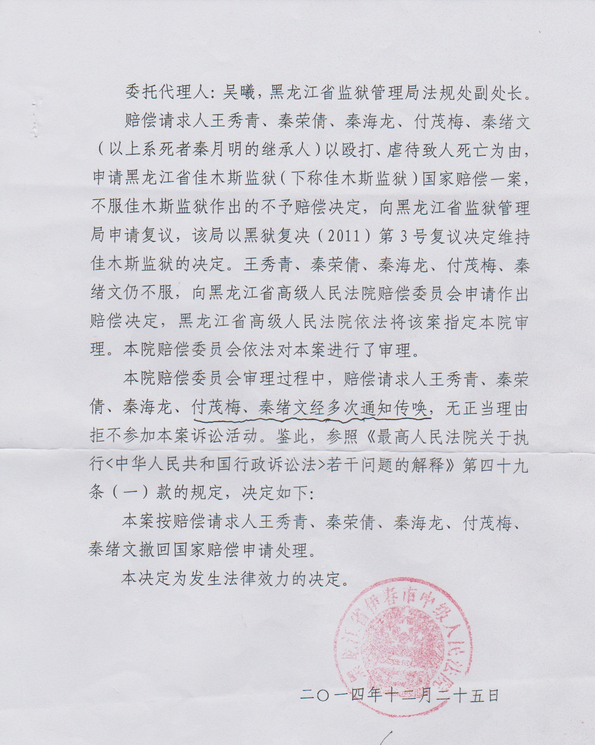 在从未联系赔偿申请人,从未开庭情况下,二零一四年十二月二十五日,黑龙江省伊春市中级法院悍然向秦月明父母——秦绪文和付茂梅两个赔偿申请人送达一份(2013)伊法委赔字第二号决定书,以所谓的“经多次通知和传唤,无正当理由拒不参加诉讼活动”为由,对五个赔偿请求人王秀青、秦荣倩、秦海龙、秦绪文、付茂梅的国赔请求按“撤回处理”。而且此决定只寄给了秦月明在山东农村老家的父母,并没有给秦月明妻女三人,也没有给案件的三位代理律师。