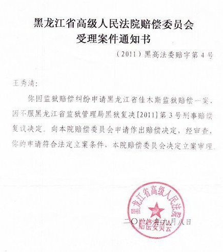秦月明家属历经千难万难,向佳木斯监狱、合江地区检察院、黑龙江省监狱管理局申请和复议后,又经国家赔偿程序诉讼至黑龙江省高级法院赔偿委员会。黑龙江省高级法院于二零一一年九月八日立案受理。