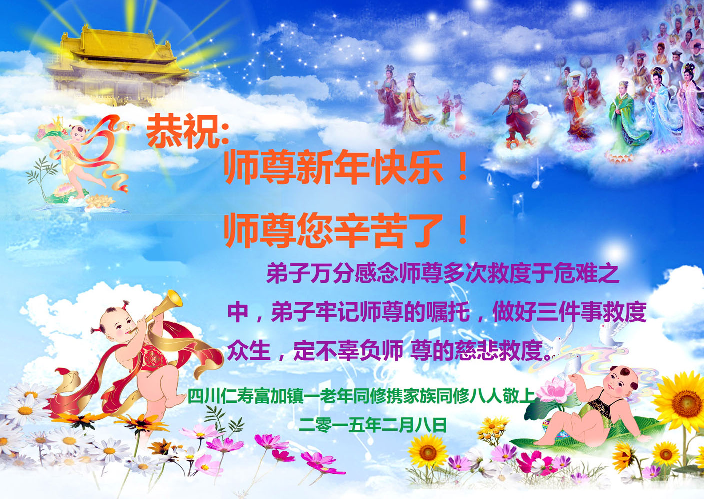 <英文版: http://en.minghui.org/html/articles/2015/2/17/148539.html>各行业大法弟子恭祝师尊过年好(28条)
