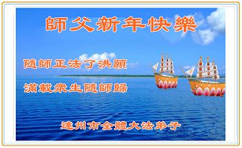 值此二零一五年度新年佳节即将到来之际,郑州铁路局全体大法弟子恭祝至尊至上慈悲伟大的师尊新年快乐!寰宇已经走到了最后的最后,师尊无量慈悲,为宇宙众生的得救和大法弟子的得度承受巨大,对师尊的感恩我们无法用人类的语言表达,唯有紧跟师尊走好最后的路,尽全力做好三件事,救度更多众生,以回报师尊的浩荡佛恩!