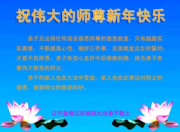 山东青岛平度教育界大法弟子恭祝师父过年好!吉林大学科技楼炼功点大法弟子恭祝恩师新年快乐!黑龙江教育系统大法弟子恭祝师父新年好!河南高校大法弟子恭祝师尊新年快乐!