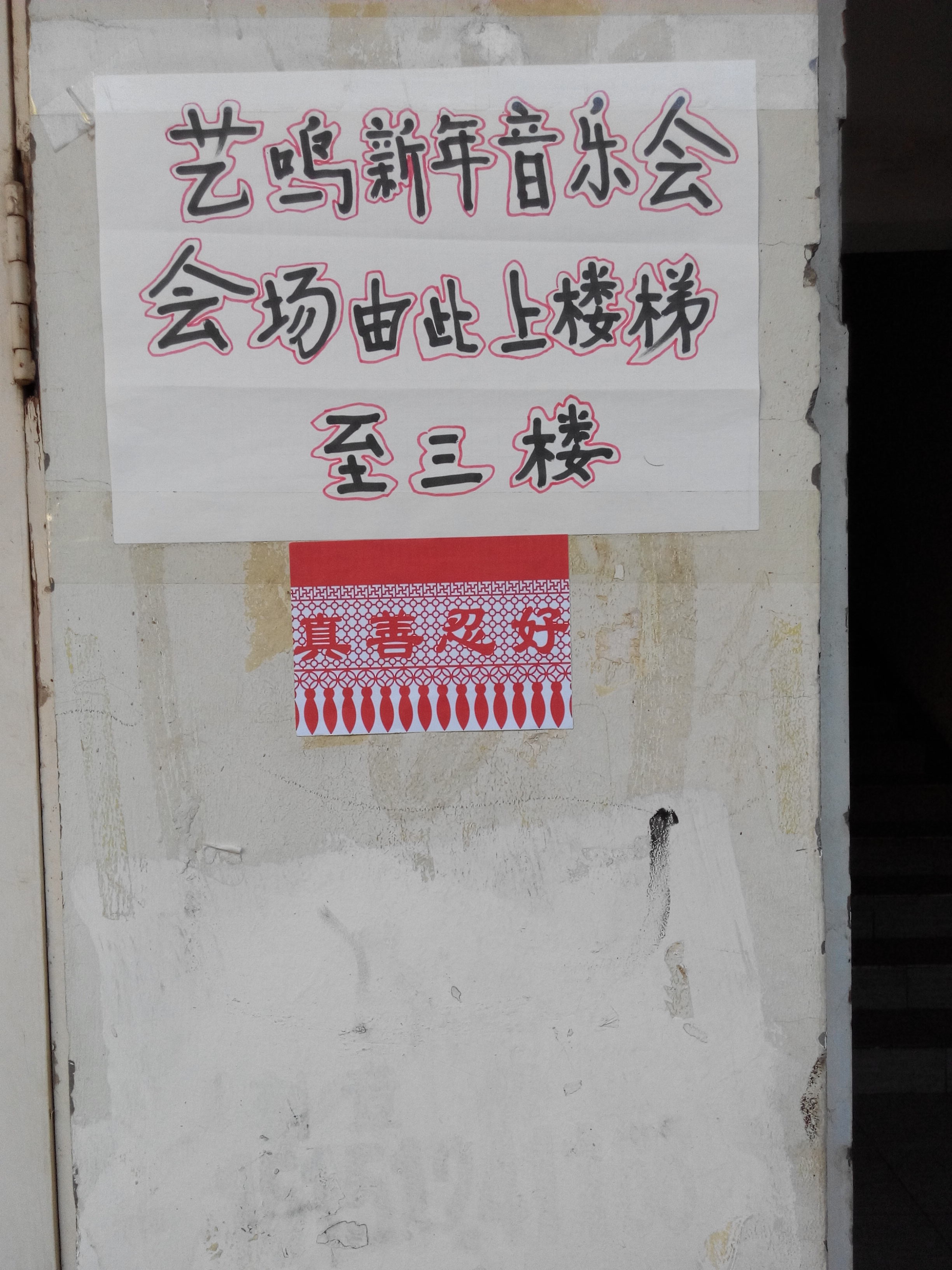 楼梯拐角处与店家歇业告示相伴的“真善忍好”剪纸