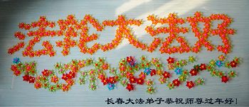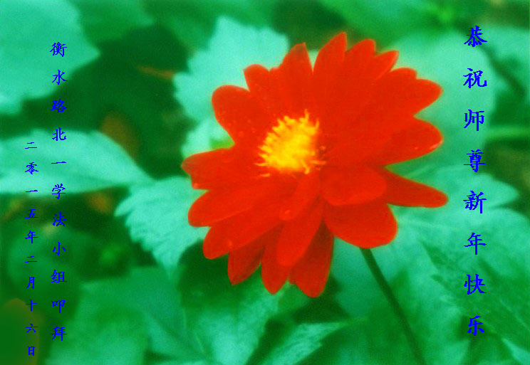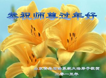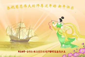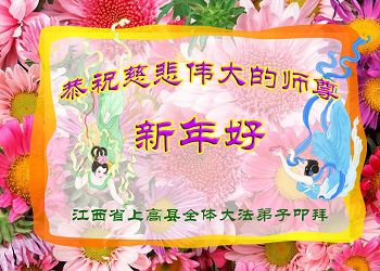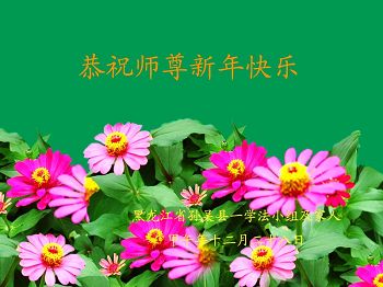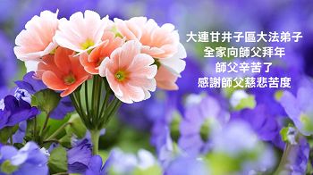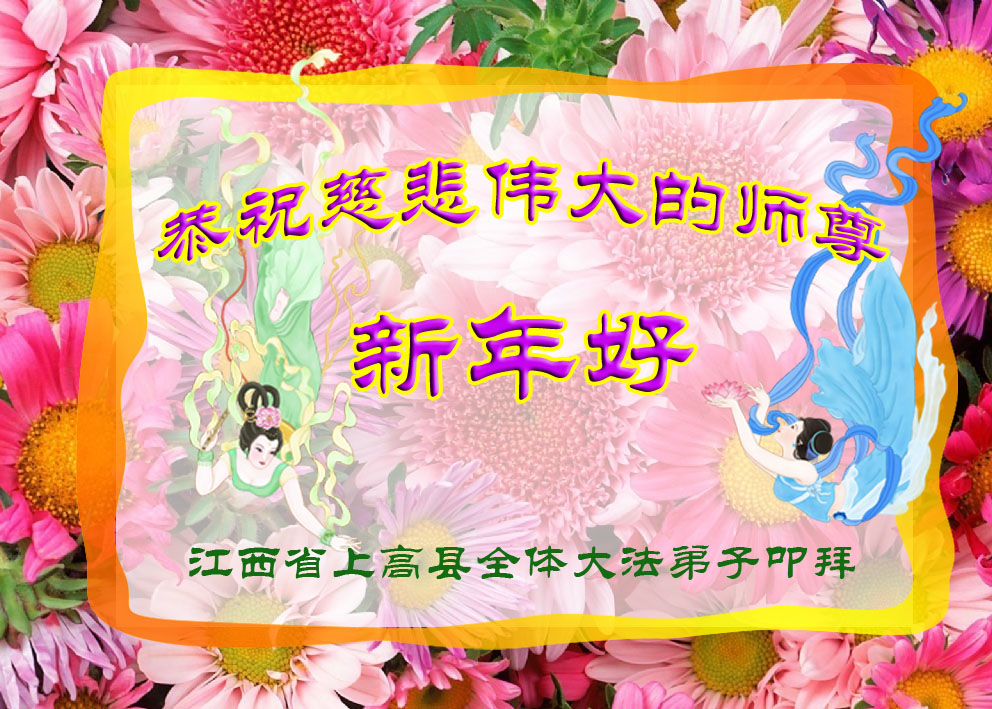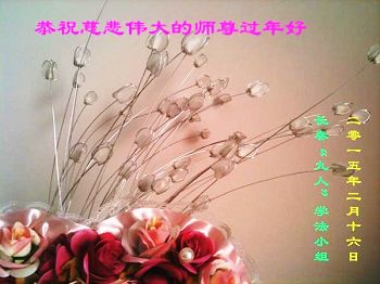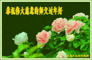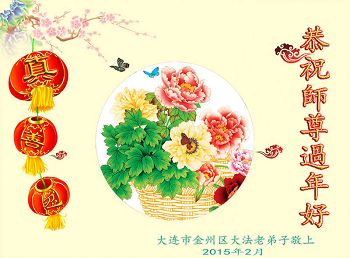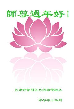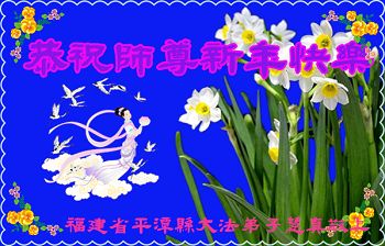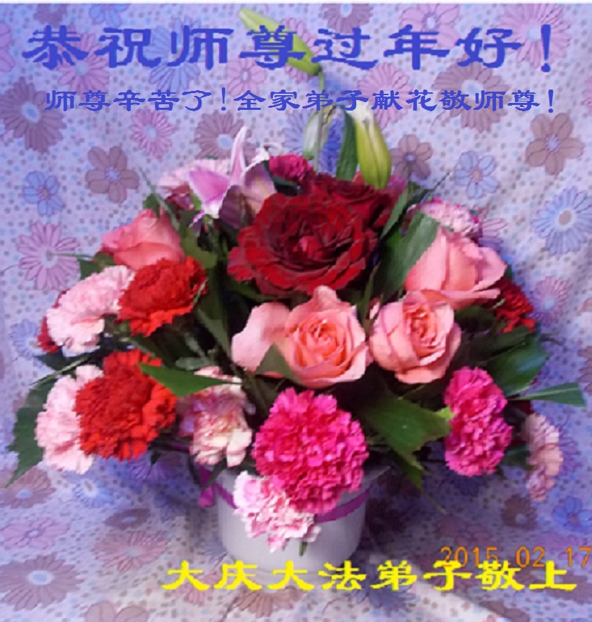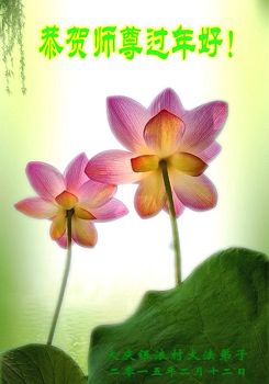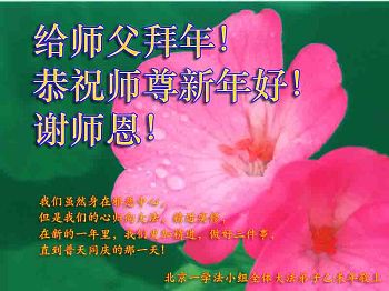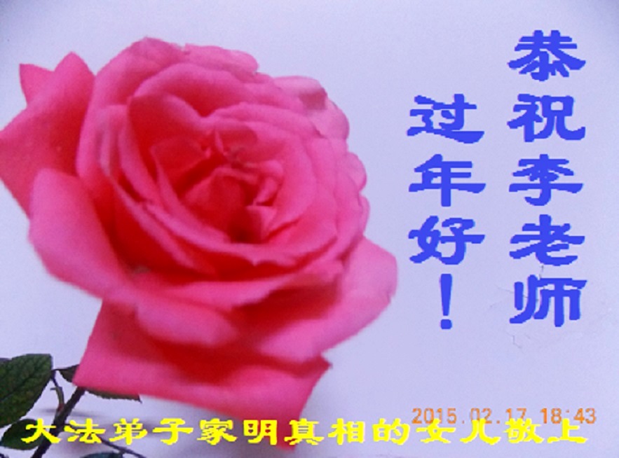 我今年79岁了,我以前因为胆小怕共产党的那一套整人的伎俩,不支持我的亲人炼法轮功, 后来在亲人的劝说下看了《九评共产党》、《神韵》、《未来人的神话故事》等等真相小册子之类,彻底明白了真相,我常念法轮大法好,身体更加健康,有时我还看看大法书籍,我昨天去买来鲜花给您敬上,又叫我外孙女帮我做成贺卡给您拜年! 谢谢李大师!