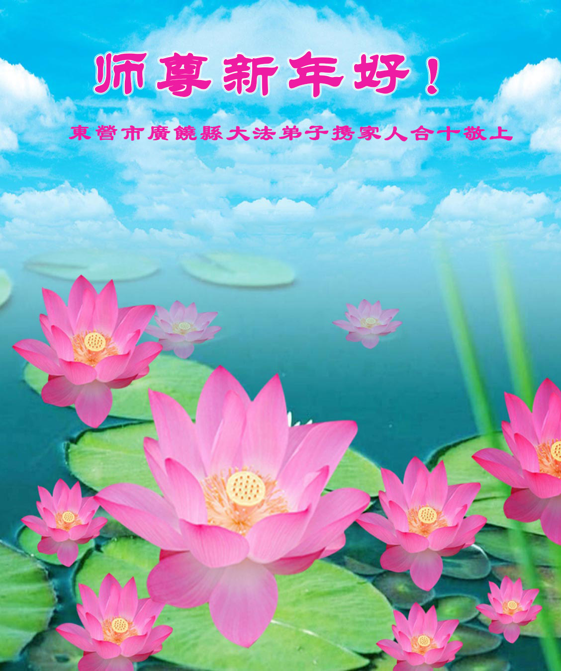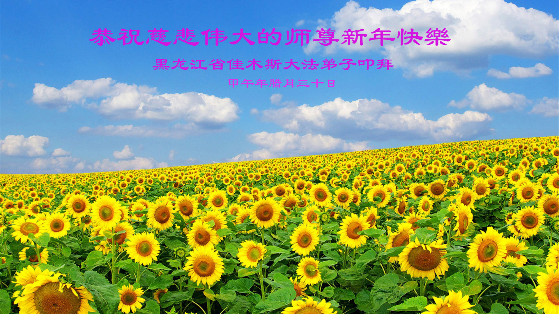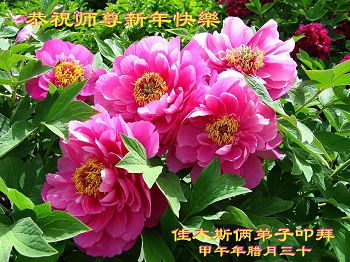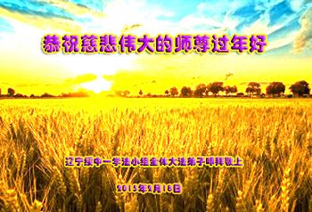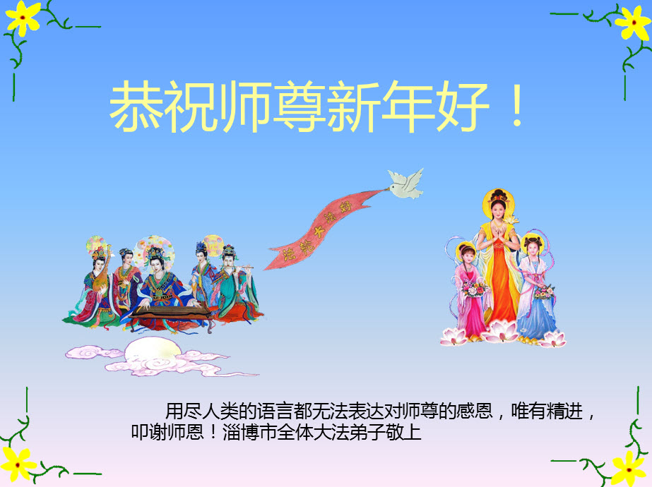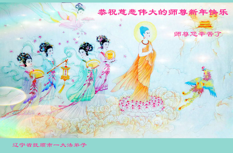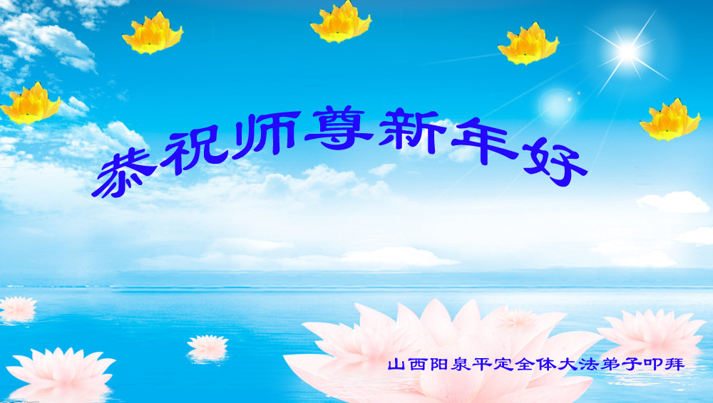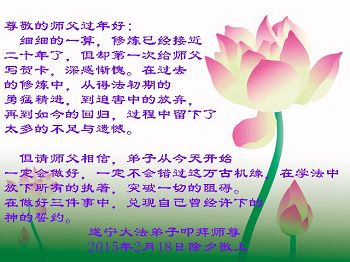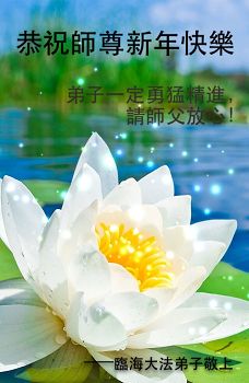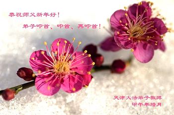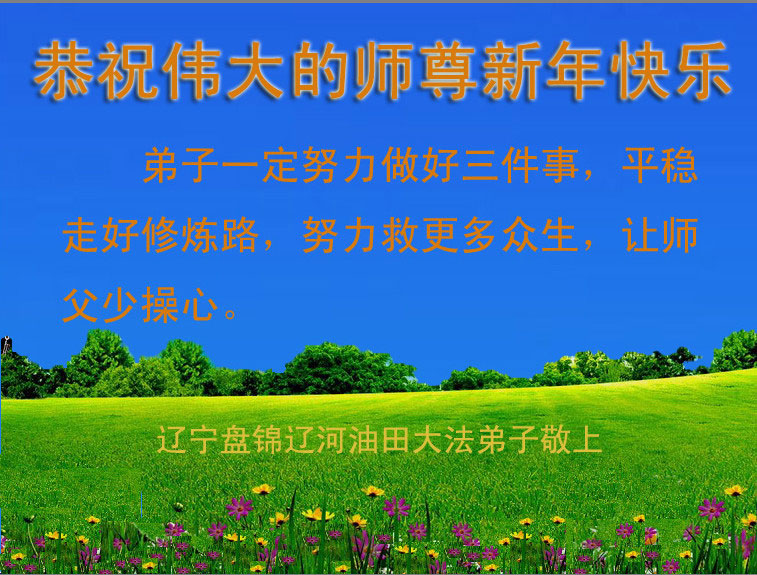 尊敬的师父您好!甲午年即将过去了,这一年我们没有白过,在师父的指导下,我们各方面都取得了一定的成绩。但是,与师父的要求相比还差的很远。我们决心在乙未年,更加听师父的话,加倍努力,克服松懈情绪,拿出得法初期的那股劲头,進一步按师父的要求做好三件事,兑现自己的誓约,救度更多的众生,早日圆满跟师父回家。请师父放心。跪拜师尊!