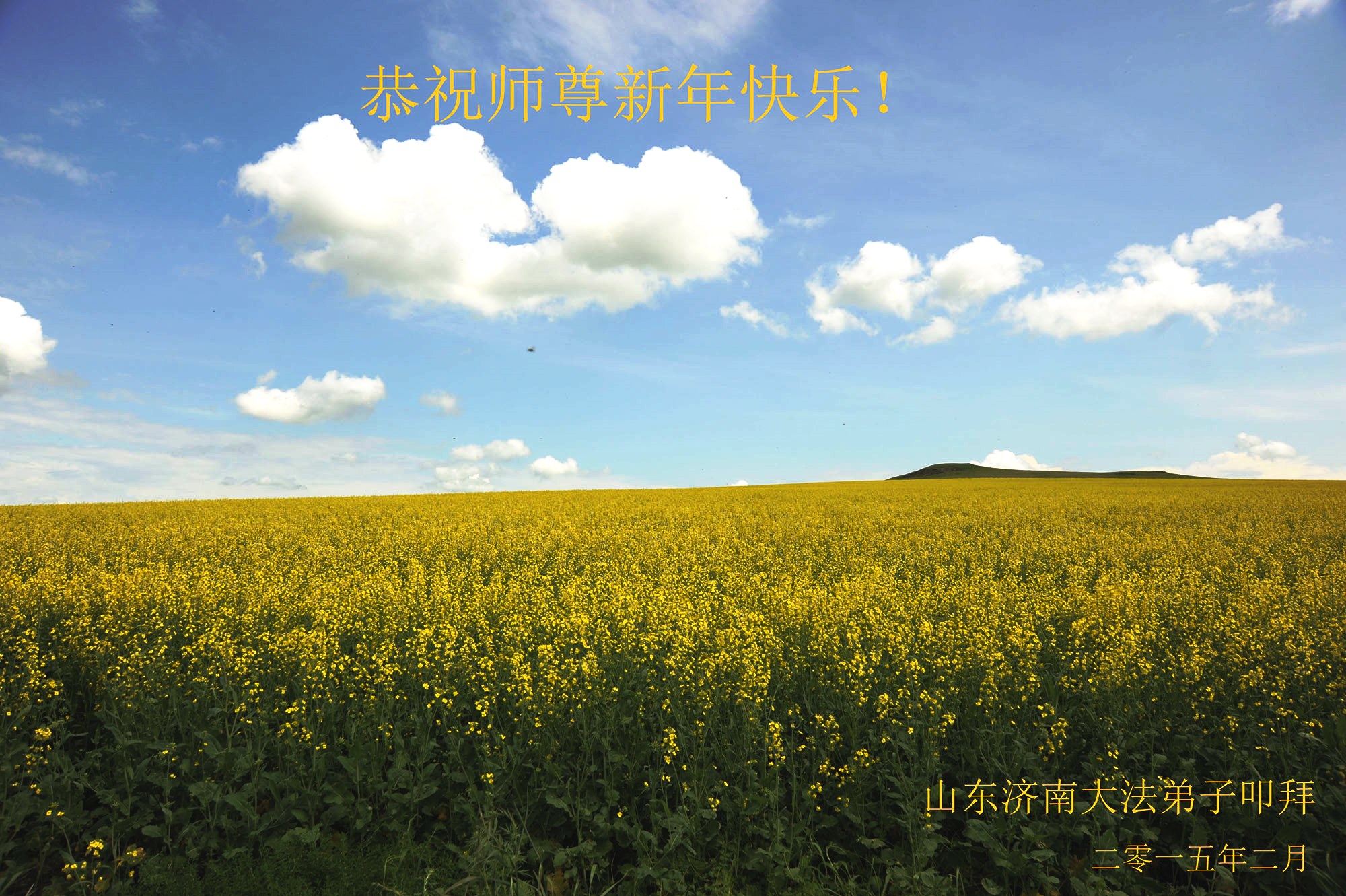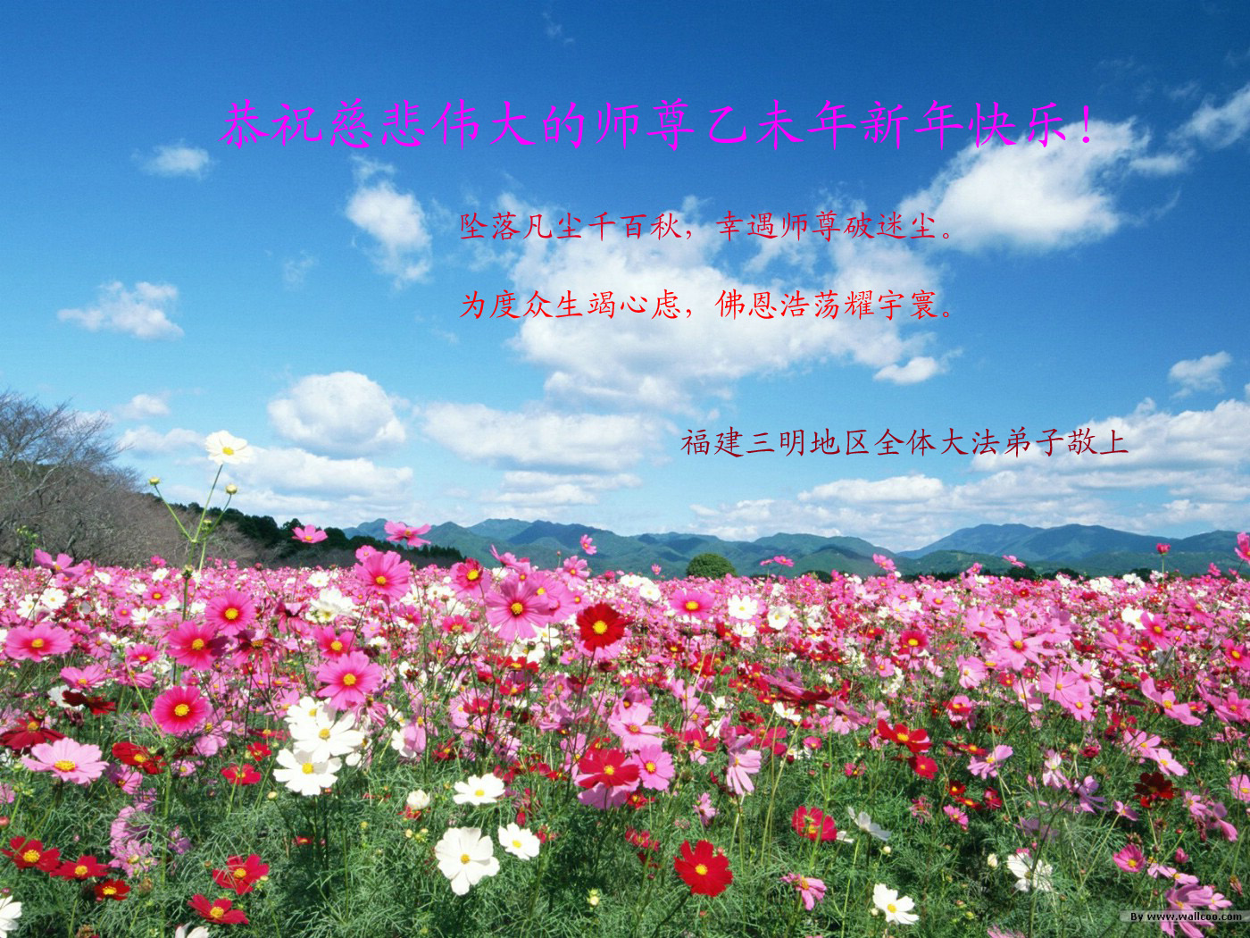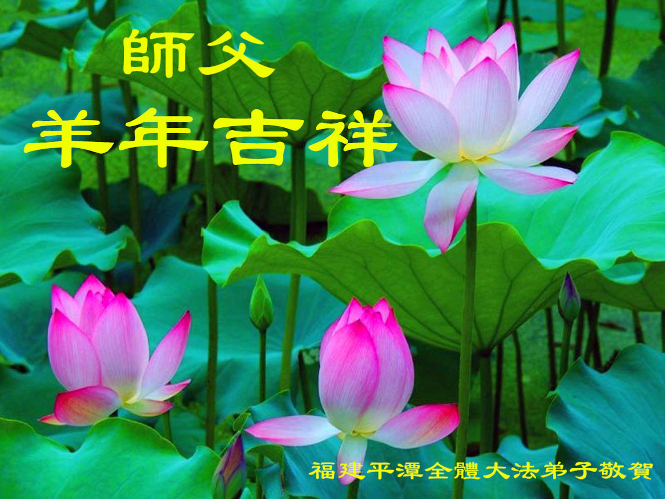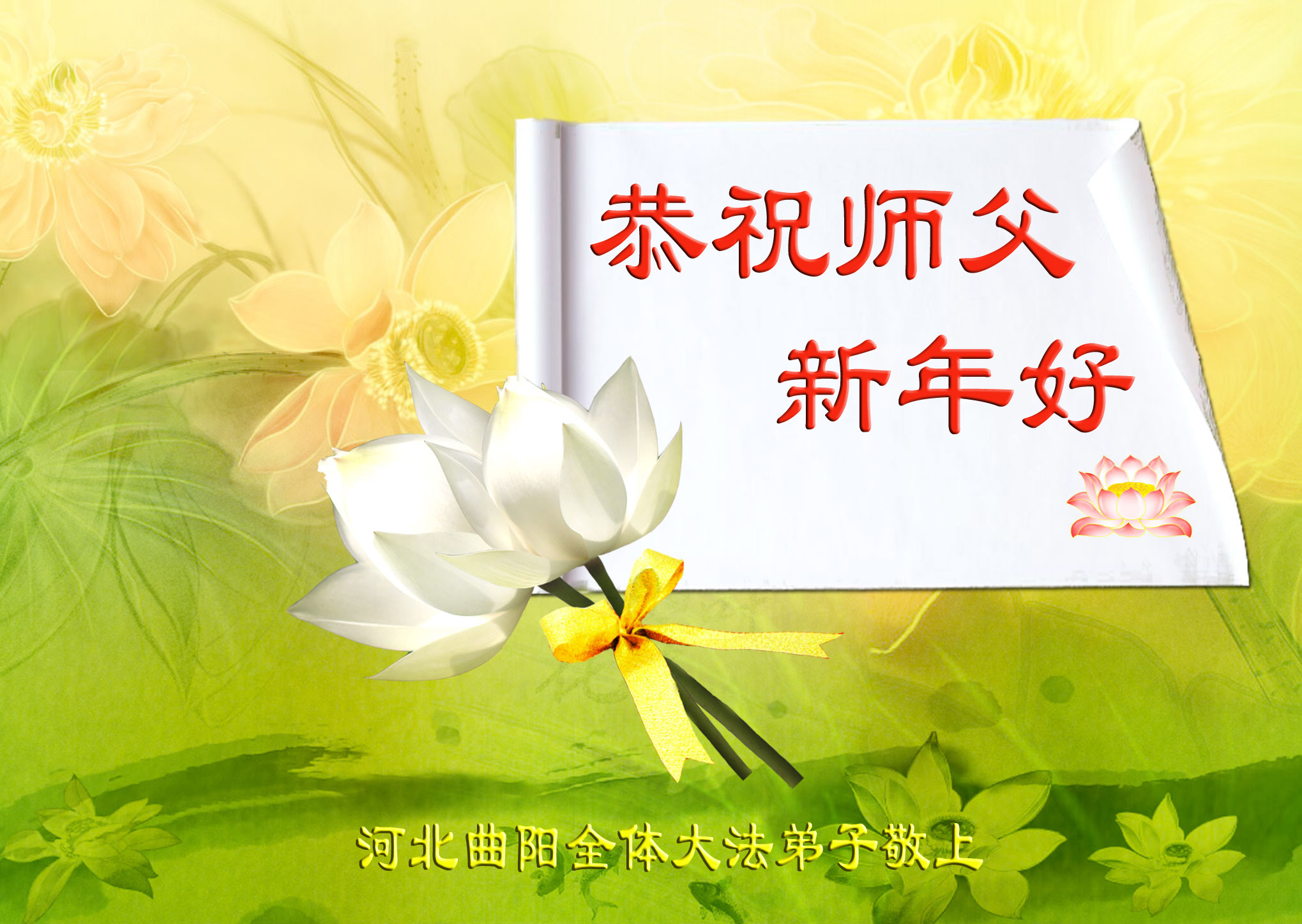 尊敬的师父您好!甲午年即将过去了,这一年我们没有白过,在师父的指导下,我们各方面都取得了一定的成绩。但是,与师父的要求相比还差的很远。我们决心在乙未年,更加听师父的话,加倍努力,克服松懈情绪,拿出得法初期的那股劲头,進一步按师父的要求做好三件事,兑现自己的誓约,救度更多的众生,早日圆满跟师父回家。请师父放心。跪拜师尊!