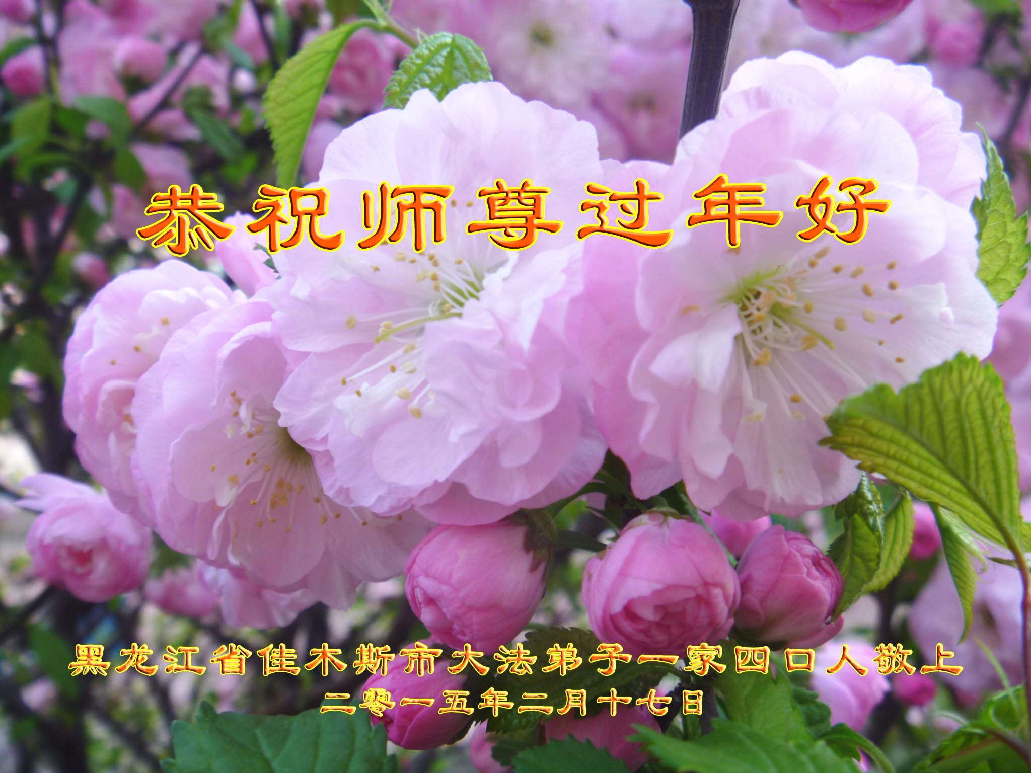我们是佳木斯大法弟子家属,新年到了,我们在这里恭祝李大师过年好!感谢李大师的慈悲救度!
