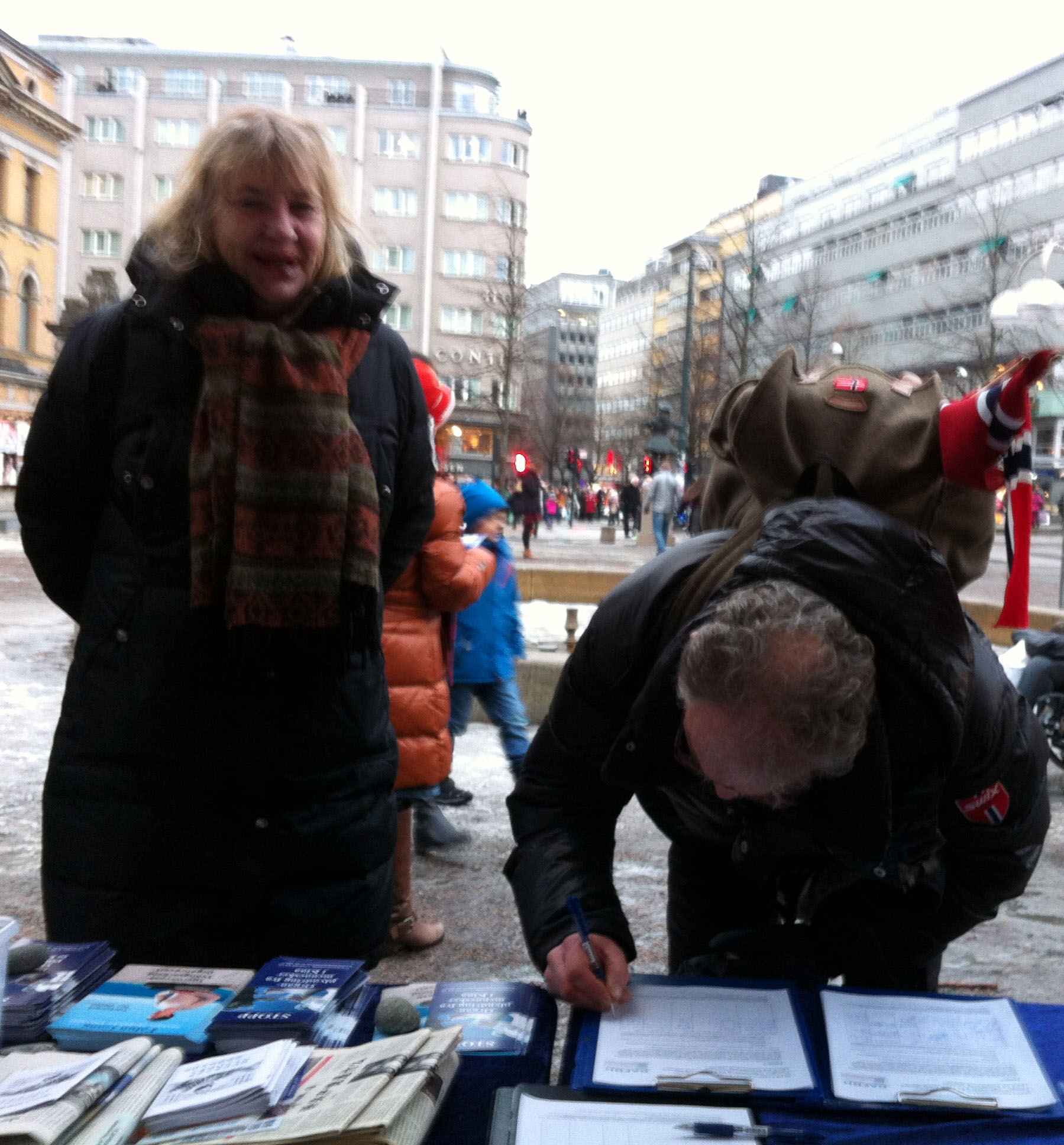 【明慧网二零一五年二月二十二日】二零一五年二月十四日星期六,部分居住在奥斯陆的法轮功学员,来到位于奥斯陆市中心的国家剧院外设立真相点,向挪威民众揭露中共对法轮功学员的迫害,同时开展制止中共活体摘取法轮功学员器官的征签活动。挪威民众在了解了中共对法轮功学员的迫害行径后,纷纷签名反迫害。