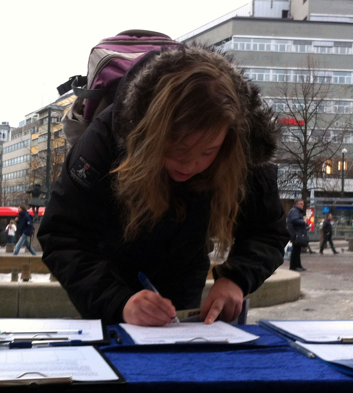 婷娜(Tina)是一位挪威女孩,在等待她的男友时看到法轮功在国家剧院前的真相点。她二话不说就在征签表上签了名。她说:“每个人都要出力,你们做得很好。我要让我的朋友也来签”。不一会儿,婷娜带着一位年轻人来到真相点,这位年轻人叫阮龙(Long Nguyn),他的家庭曾为躲避越共而逃到挪威,他还说婷娜跟他讲了关于中共活摘法轮功学员器官以及签名反活摘的事,他表示他应该要签名。
