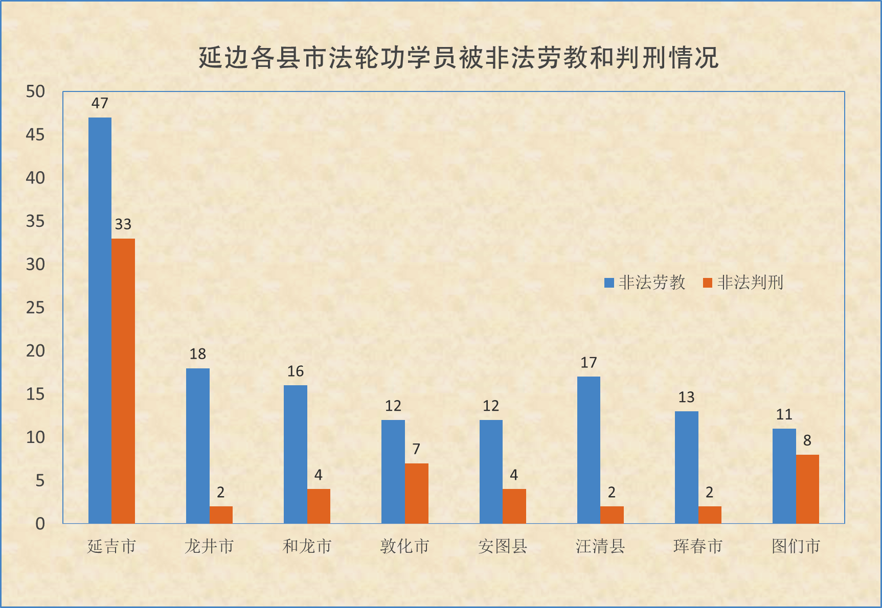 自1999年10月延吉市法轮功学员林世雄被非法劳教起,至2013年末中共劳教制度废除前敦化市法轮功学员王相菊被非法劳教,据不完全统计,延边州各县市被非法劳教的法轮功学员人数约146人,劳教期限为1年至3年。