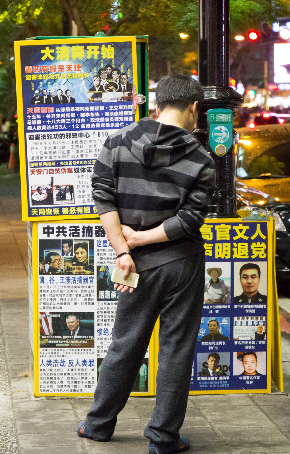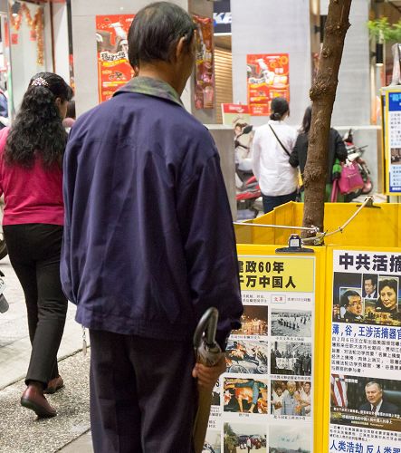 法轮功真相展板吸引许多过往的民众驻足观看。