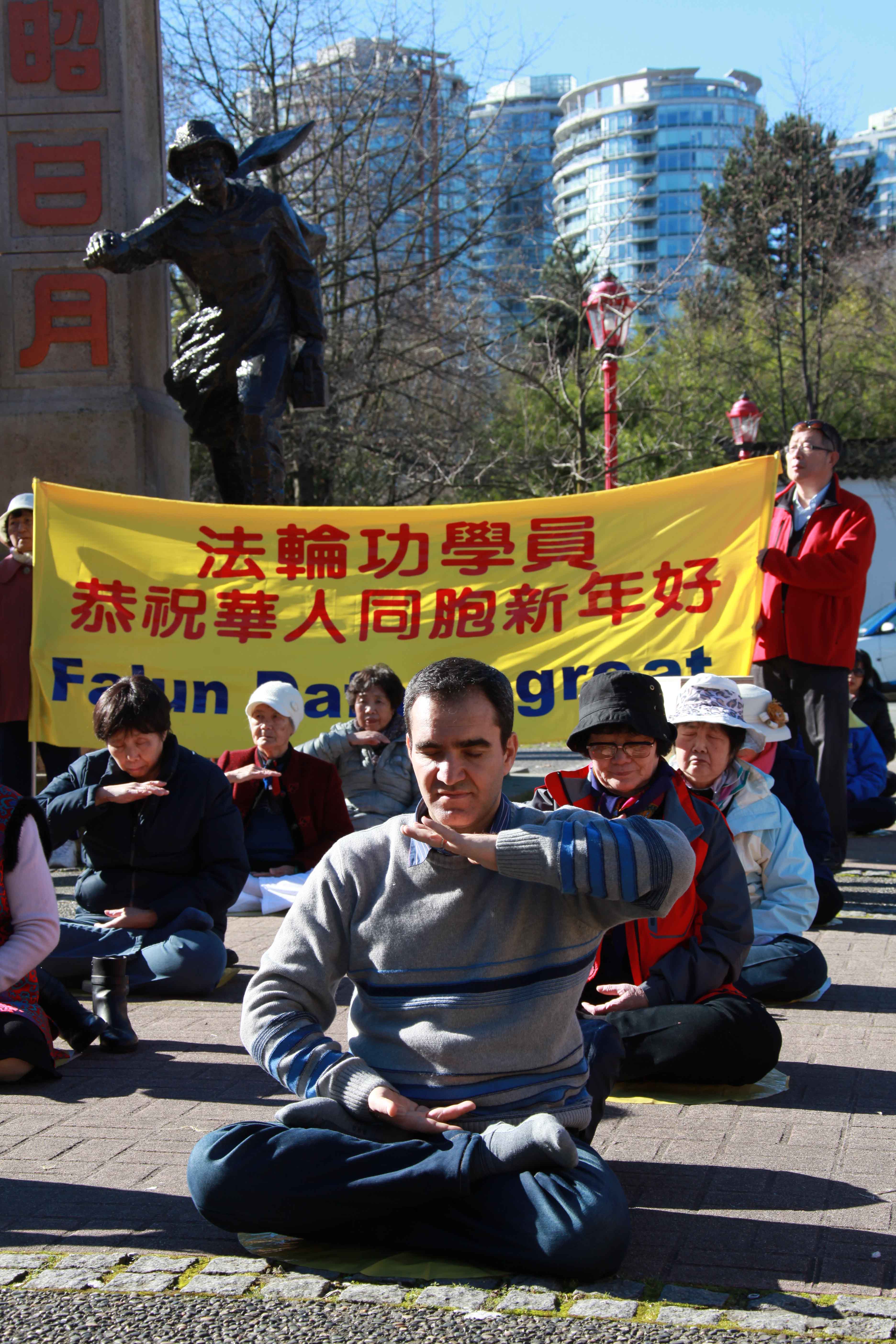 在中国城附近居住了十多年的Dominic Richard先生表示,他对法轮功有一些了解,看到过多次法轮功活动。他在现场停留很久,观看法轮功学员炼功。他说:“祥和的功法,对人友好,我想学炼很久了。我身体不好,我认为通过炼法轮功可以对我身体健康有帮助。我一直在观看他们的动作,我知道这是最基本的动作。我知道中国传统的功法对身体有好处,我对法轮功很感兴趣,我拿了资料,准备学习。”