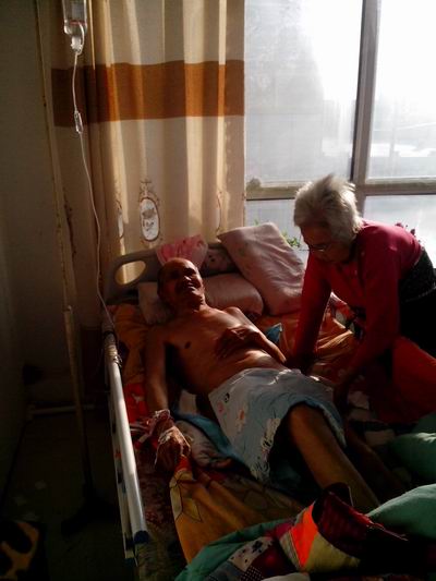 上图为:石孟昌的老父亲,因儿子、儿媳被迫害着急上火而病倒住院,经过一个多月的抢救治疗,命算是保住了,但瘫痪在床至今,老母亲不离左右的照顾着老伴。