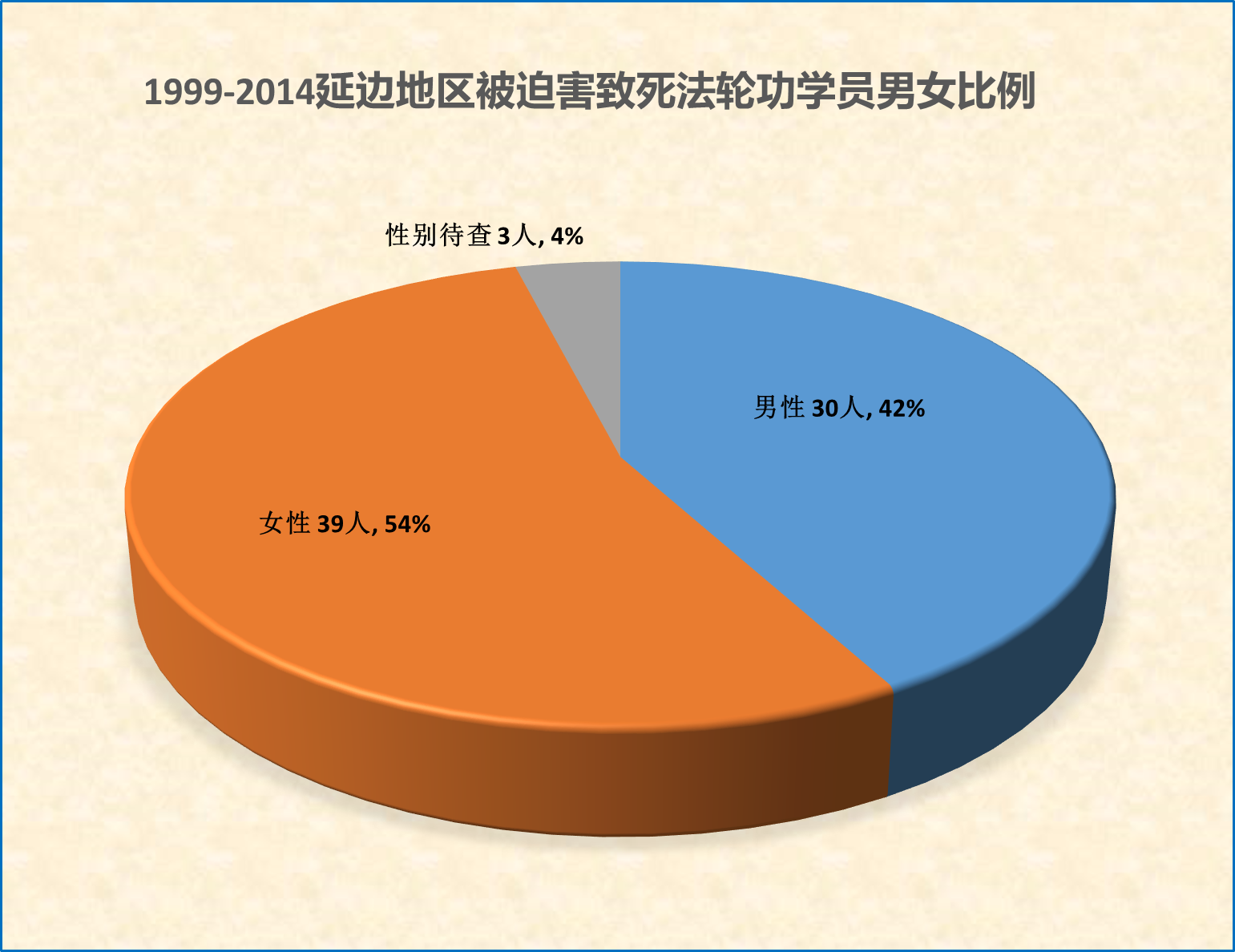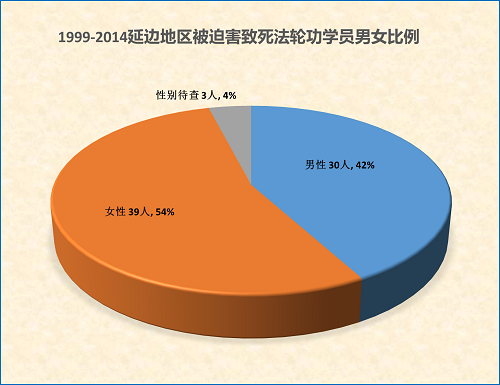 在江泽民、罗干操控相关部门对法轮功学员“肉体上消灭”、“打死算自杀”的邪恶密令指使下,据不完全统计,十五年来延边法轮功学员被迫害致死者多达72人,其中已经核实年龄在六十岁以上的学员27人,四十岁以下的学员11人。被迫害致死的法轮功学员男性比例占42%,女性占54%,性别待查者占4%。这些法轮功学员中有因坚持信仰被相关部门酷刑折磨致死的,也有在中共种种迫害压力下不能正常修炼导致生病而死的。而1999年7.20中共镇压开始后,这种被直接或间接迫害离世的法轮功学员人数究竟有多少?具体情况如何?还需要进一步查找核实。