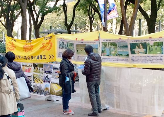二零一五年一月三十日至二月一日,日本中部地区法轮功学员在爱知县首府名古屋市中心的久屋大通公园附近,告诉世人法轮功真相。三天内,有一百多位中国人做了“三退” (退出中共邪党及其团队组织)。