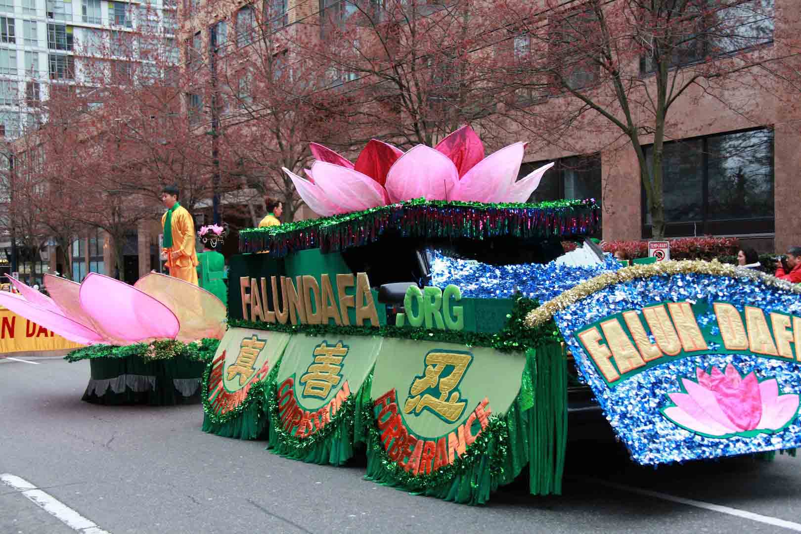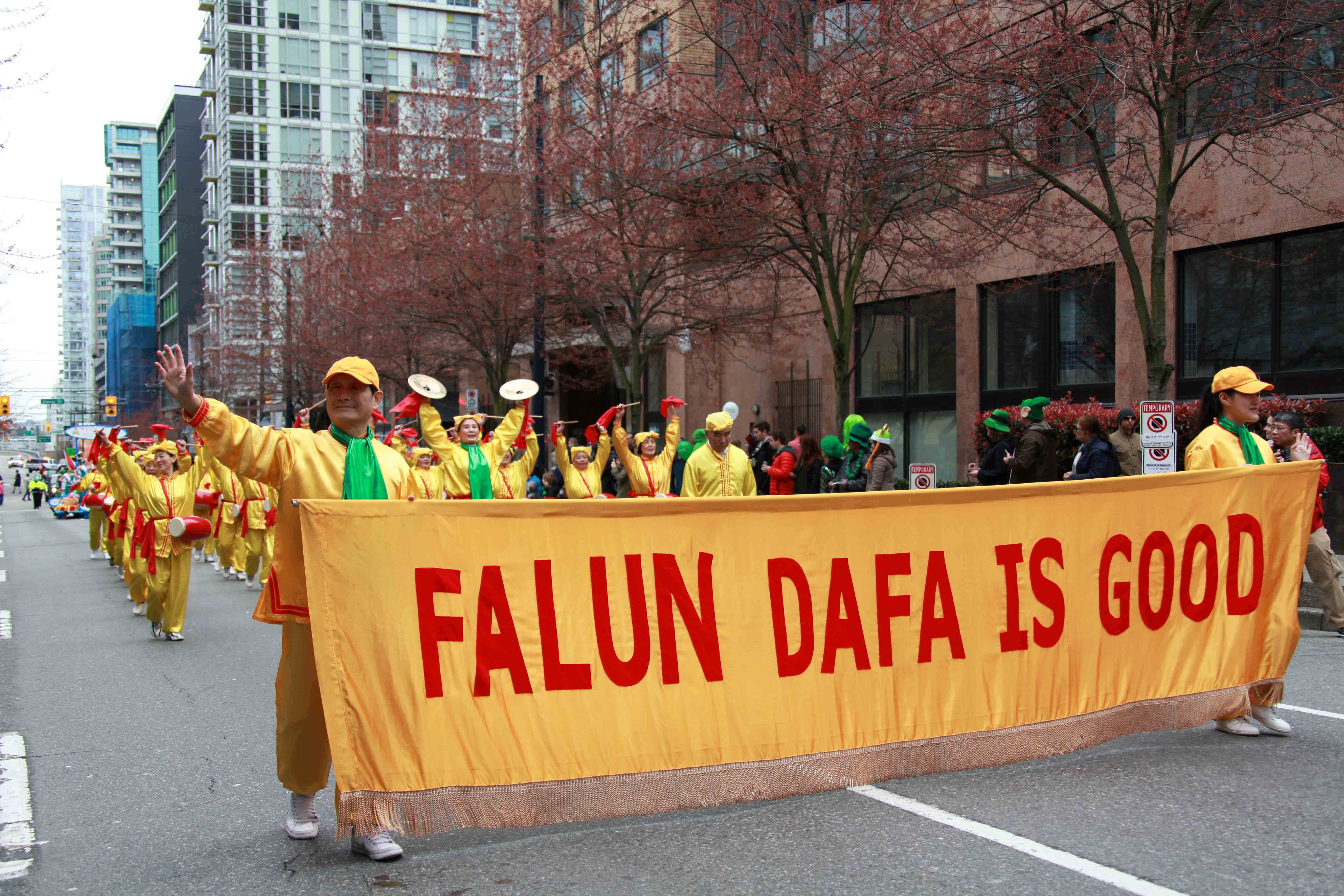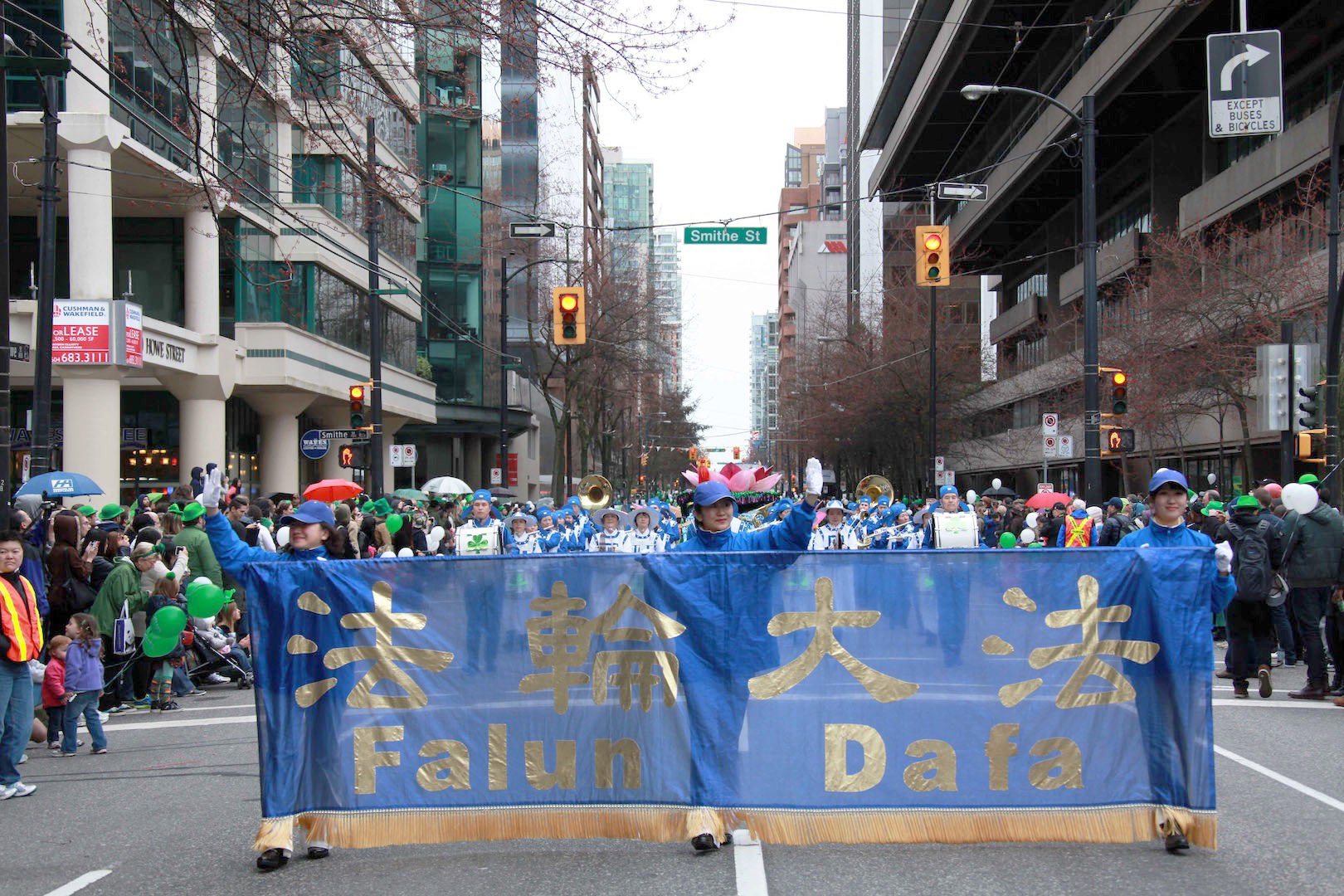 在溫哥华市中心举办的一年一度的圣派翠克节的游行(St. Patrick's Day)已经成为溫哥华人迎接春天的盛事,今年有六十多个团体参加,法轮功学员的游行队伍包括天国乐团,“真善忍”主题花车,腰鼓队等组成,受到观看游行的市民们的热烈欢迎,沿路的很多市民纷纷拍摄法轮功学员的游行队伍。