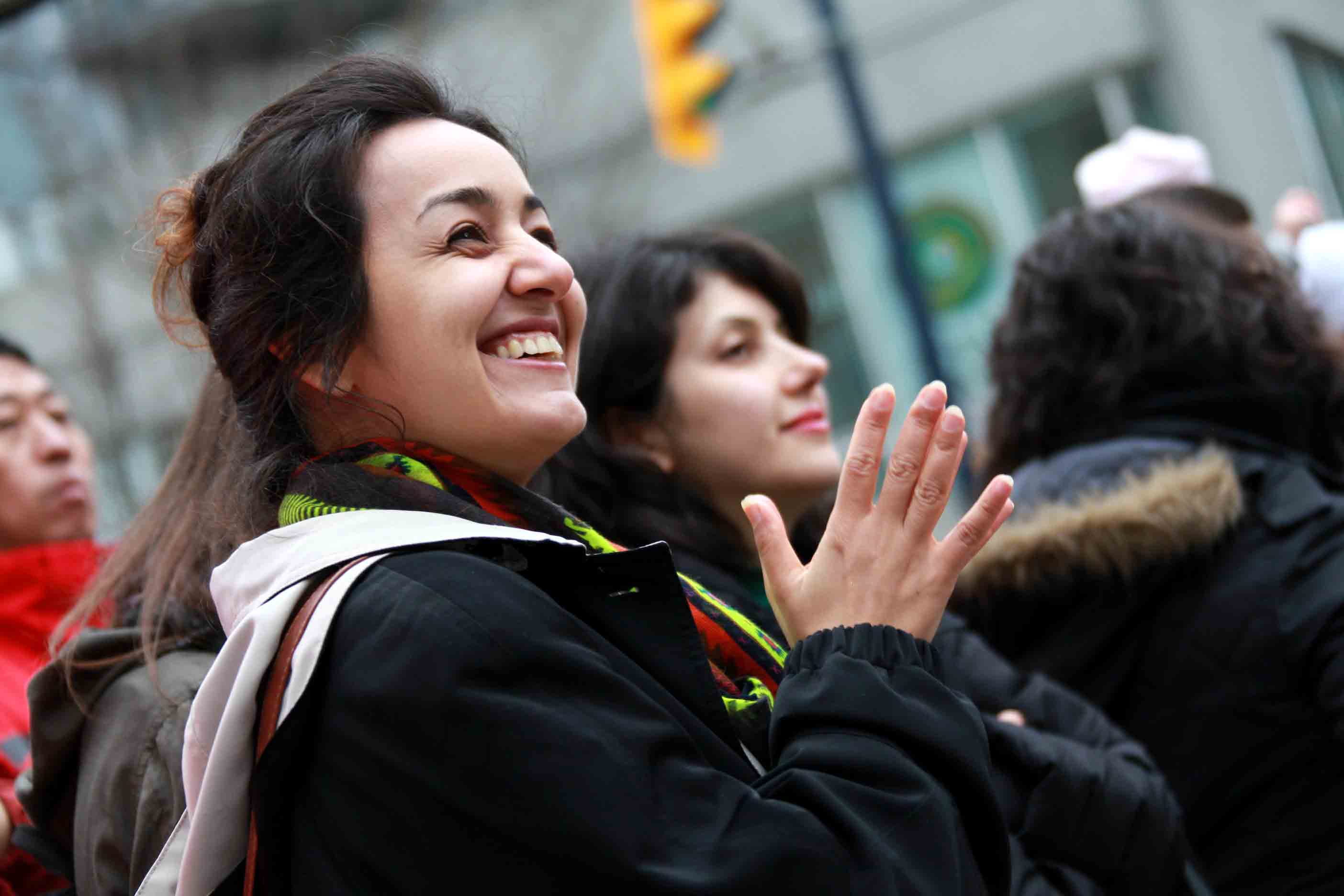 ![]() 图4:一名女士看到法轮功的队伍开心的鼓掌 |