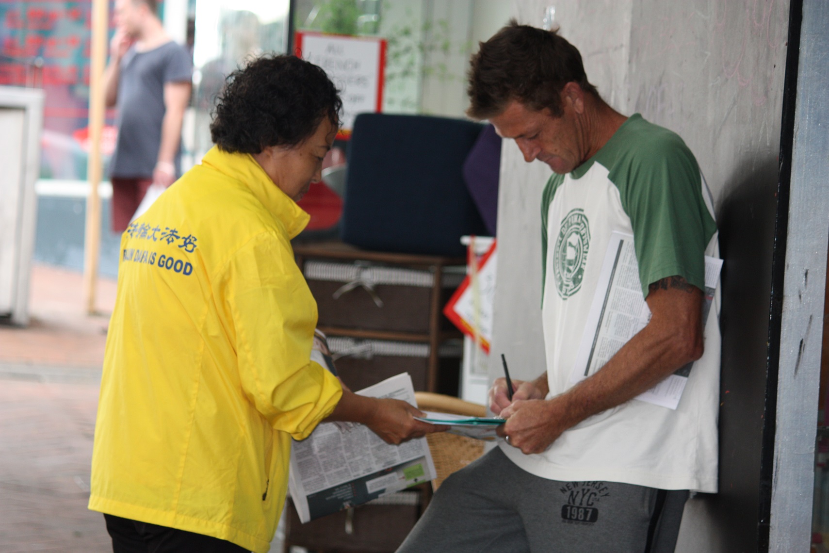 【明慧网二零一五年三月十八日】(明慧记者华清悉尼报道)二零一五年三月十五日,法轮功学员在澳洲悉尼最多华人聚集地赫斯维尔(Hurstville)市中心的主街上举横幅、讲真相,揭露中共活摘法轮功学员器官的罪行,当地市民踊跃签名支持制止“活摘”罪行;华人积极接资料、了解真相、做“三退”。