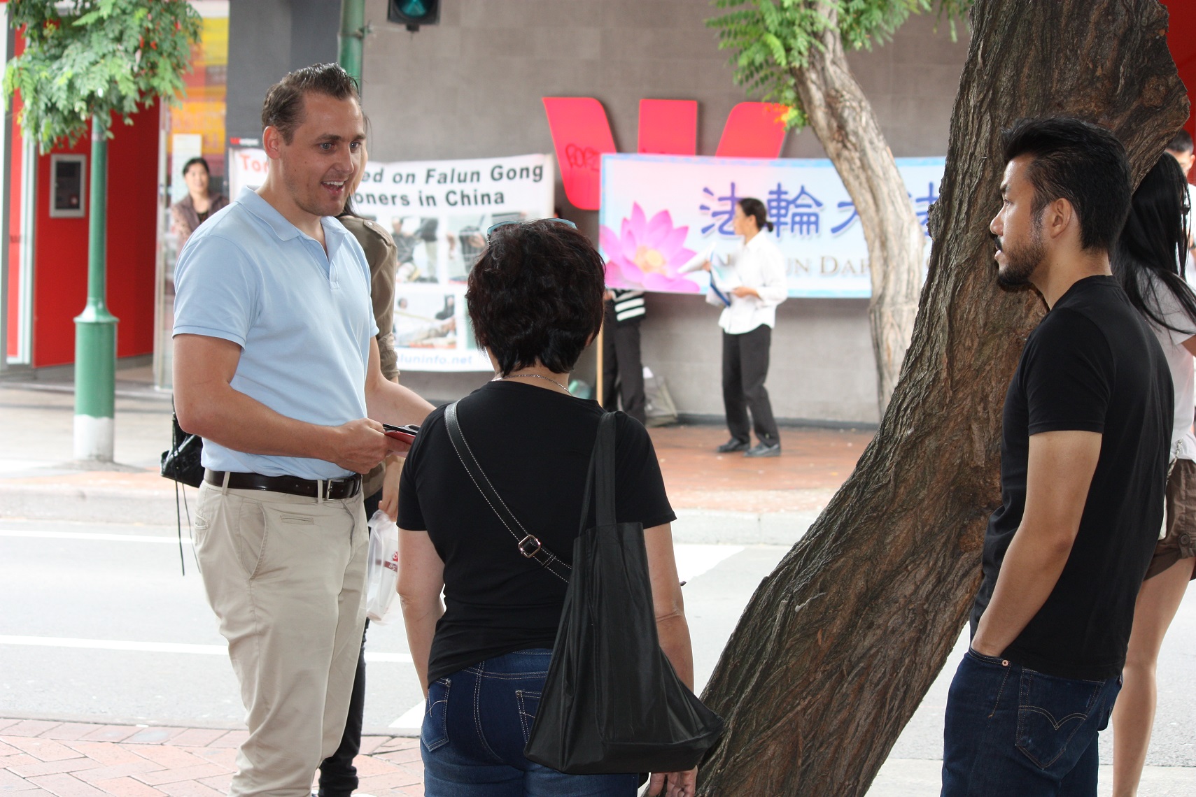 西人学员亚历克斯(Alex )遇见一位韩国人布鲁斯(Bruce Butler),就自然和他聊了起来,布鲁斯告诉亚历克斯他自己的母亲是中国人,妈妈曾听说过关于 “活摘”之事。亚历克斯接着解释,我发现任何知道中共邪恶的人,一听说“活摘”马上就相信并支持我们反对中共“活摘”的罪行。反而中国人受了中共反面宣传就不容易接受。其它国家的人非常能接受和相信这个(“活摘”)事实,根本就没有疑问。布鲁斯完全能理解这个“活摘”之事,并知道很多中共的其它罪行,布鲁斯做了签名支持并希望“活摘”之事尽快被制止。