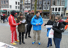 三月二十一日正值周末,荷兰首都阿姆斯特丹游客很多,往来的行人被法轮功炼功音乐所吸引,纷纷在法轮功学员的展板前驻足观看。