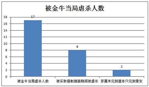 截至2015年2月,被金牛区当局直接虐杀的法轮功学员至少17人,其中,在被采取非法措施期间死亡的8人,8人中,有两人家属没见到遗体、只见到骨灰。