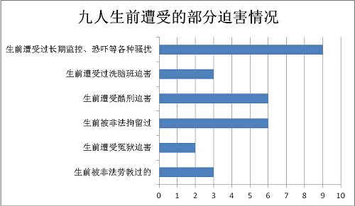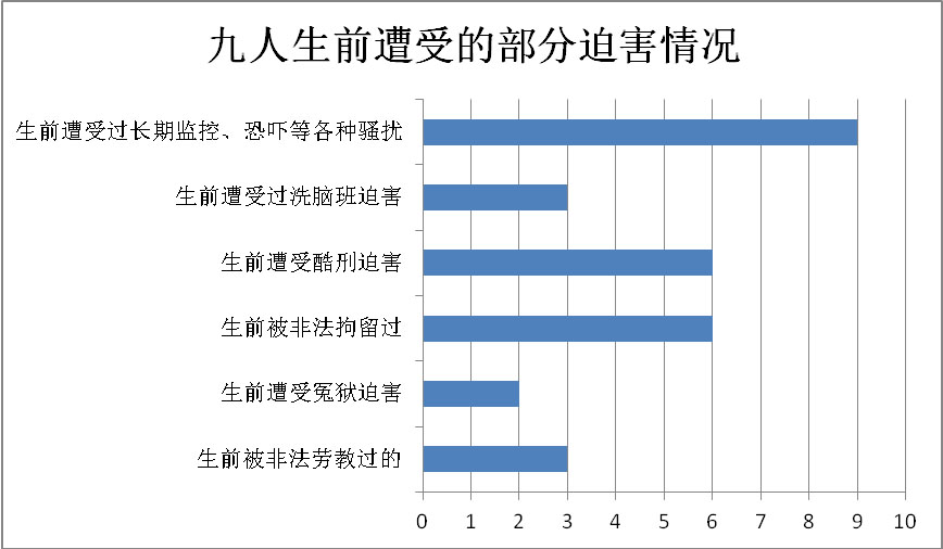 3、另外不是在被采取非法措施期间被虐杀的九人,有的是在被采取非法措施期间,由于酷刑、虐待致生命垂危、或身体严重伤害,导致回家后死亡(包括当局将人迫害致生命垂危、为推卸责任将人放回家后死亡的);有的是遭受多种非法措施及长期的酷刑、虐待,以及反复骚扰、恐吓等,也就是长期的全方位的各种迫害叠加在一起造成的虐杀和非正常死亡。