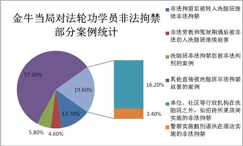 2、非法拘禁案例中,洗脑班非法拘禁占80.40%的绝大多数,也显出洗脑班对于非法拘禁的重要意义,它使得非法拘禁更为随意、方便,而且更加集中和系统性。