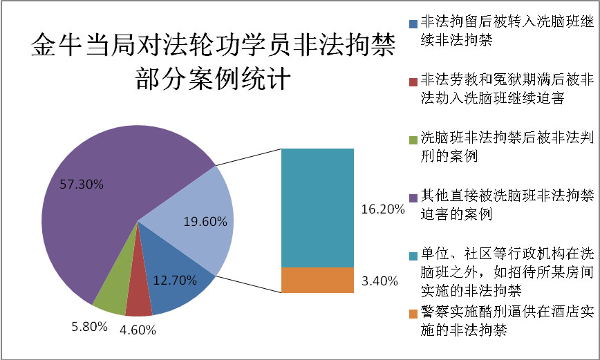 记录到的非法拘留案例(包括因开始的酷刑将人致残而未遂的对钟、周二人的非法拘留;但不包括迫害之初金牛区作为试点办洗脑班期间的集体非法拘留案例)共计142人次,共85人。