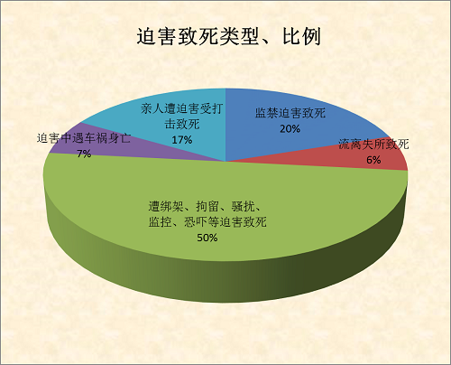 类型监禁迫害致死流离失所致死遭绑架、拘留、骚扰、监控、恐吓等致死迫害中遇车祸身亡因亲人遭迫害受打击致死