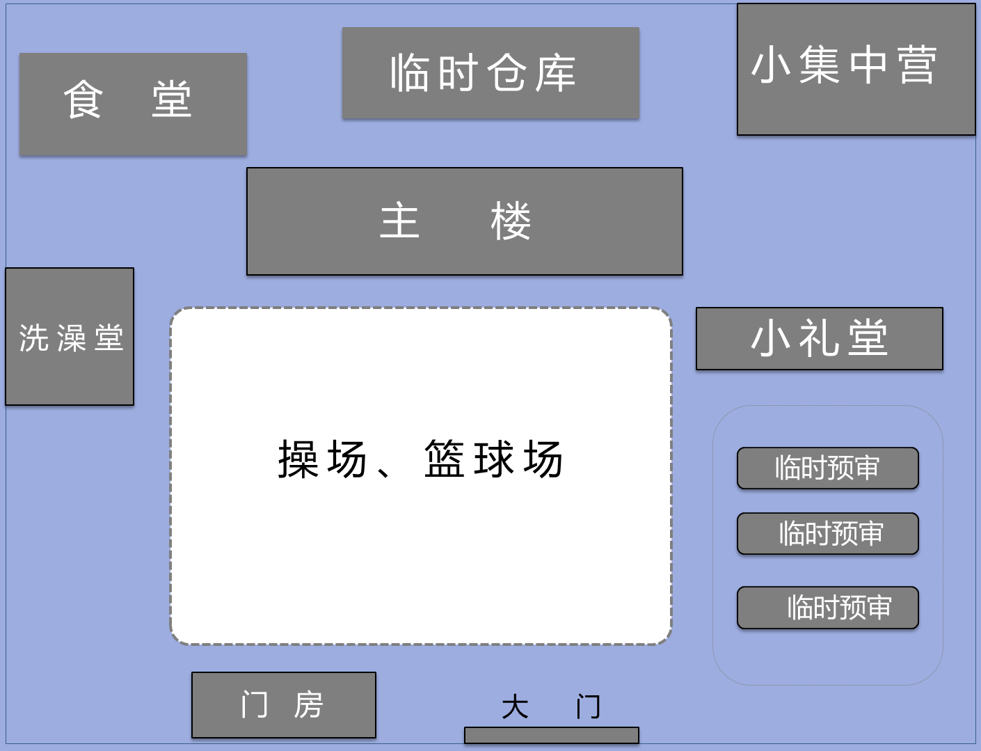 在礼堂的后面、靠墙的地方,是原“北京市天堂河女子劳教所”集训队原址,洗脑班用来关押北京市公安局绑架的法轮功“重点人物”。它是一个小的集中营式建筑,内部共有六个房间:三间约十二平方米的大监室,分别称作大一号,大二号,大三号。监室的窗户总是被厚厚的窗帘堵得严严实实,透不进一点阳光。屋里靠天花板上的四个灯泡来照明,二十四小时亮着,这让被关押的人不知道自己被关在什么地方,感觉不到白天黑夜、春夏秋冬的区别,从而产生恐惧、绝望的情绪。三间带小风场的禁闭室,称作禁闭一室,禁闭二室,禁闭三室。也是二十四小时亮着长明灯。禁闭室仅有约2米长,1.5米宽,前后都是密封的大铁门,风场从来不开放。所有房间都装有监视器,实施二十四小时严密监控。
