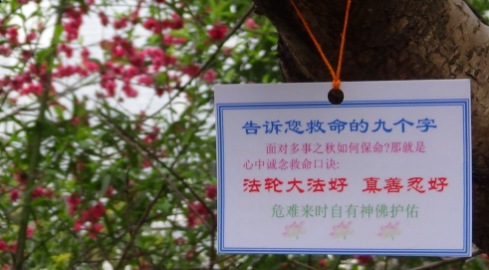 一天, 我在一景点步道沿途的树枝上悬挂了五、六个真相卡片——上面写有鲜艳醒目“法轮大法好、真善忍好”九个字。