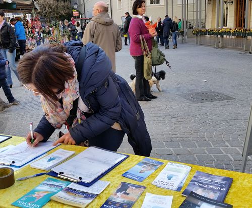 一位萨尔斯堡当地中年女士在征签表格签字后,对法轮功学员说,她知道中共侵犯人权、破坏文化、破坏自然环境、侵犯少数民族等。她表示非常支持法轮功学员举行信息日活动。她索取了学员的联系方式,并会继续和法轮功学员接触,了解更多的真相。