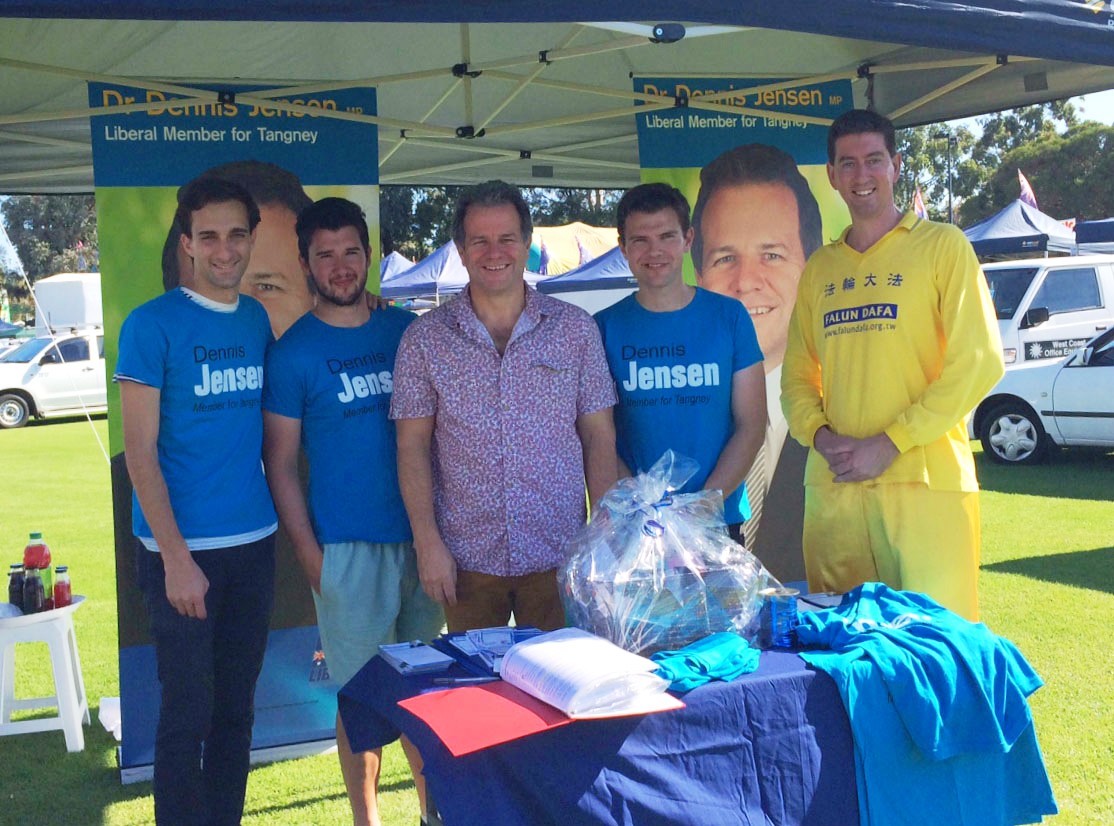 ![]() 联邦国会议员Dennis Jensen(中)及其助手们与法轮功学员 |