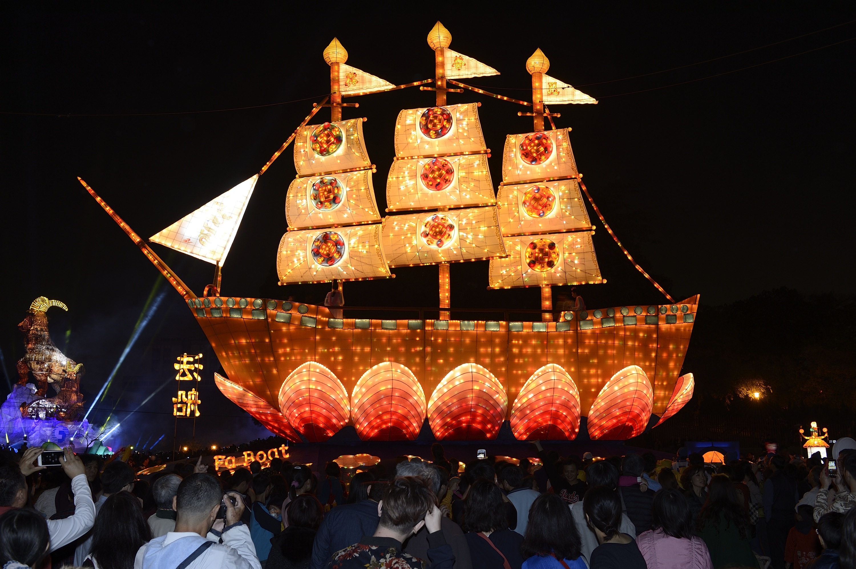 金碧辉煌的法船在台湾灯会台中灯区登场,民众赞叹,纷纷拍照留念。
