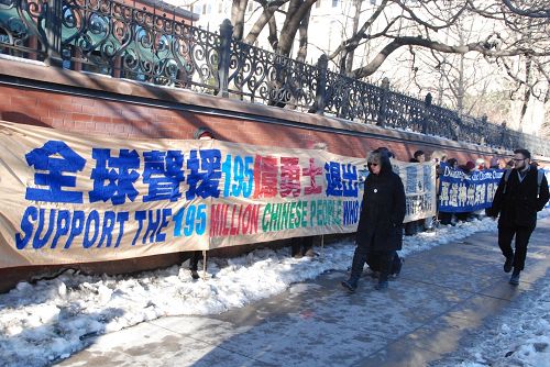 义工们新年之际不忘大陆同胞,到市政府广场劝三退。新年的第一天景点迎来了第一批游客,义工面带微笑的与导游打招呼:“导游新年好,你们辛苦了!”因天冷导游一边跺着脚一边高兴地说:“你们辛苦了,你们三百六十五天坚持在这里,你们才辛苦呢!”要知道,在去年这个导游可是对义工不太友好的啊。