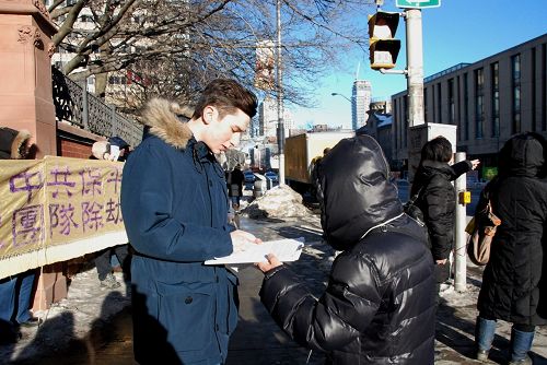 王女士说,记得一个冬天的下午,接连来了几辆校车,每车都有几十个中国留学生,当看到这些莘莘学子,慈悲之心油然而生,今天在这里有缘碰到他们,我要尽我的全力告诉他们真相,这些孩子们也非常乖,讲一个,明白一个,三言两语就退了,感觉好像就在等着我们一样。在半个小时左右的时间里,我们两个人帮助四十多名学生了解了真相,退出了团、队组织,最后告诉他们记住法轮大法好。他们都非常开心,表示感谢。