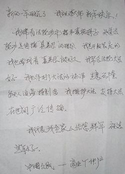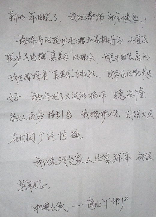 河北省平山县明真相的民众在贺卡上写着:“尊敬的李大师:法轮功就是指路灯,我们都是法轮功的受益者!是您的徒儿们教我们明白了真相,选择了美好未来。我们也一定做一个有良知的中国人,把法轮功的美好告诉更多的人。千言万语汇成一句话:‘法轮大法好,真善忍好!’值此新年到来之际,恭祝李大师过年快乐!”