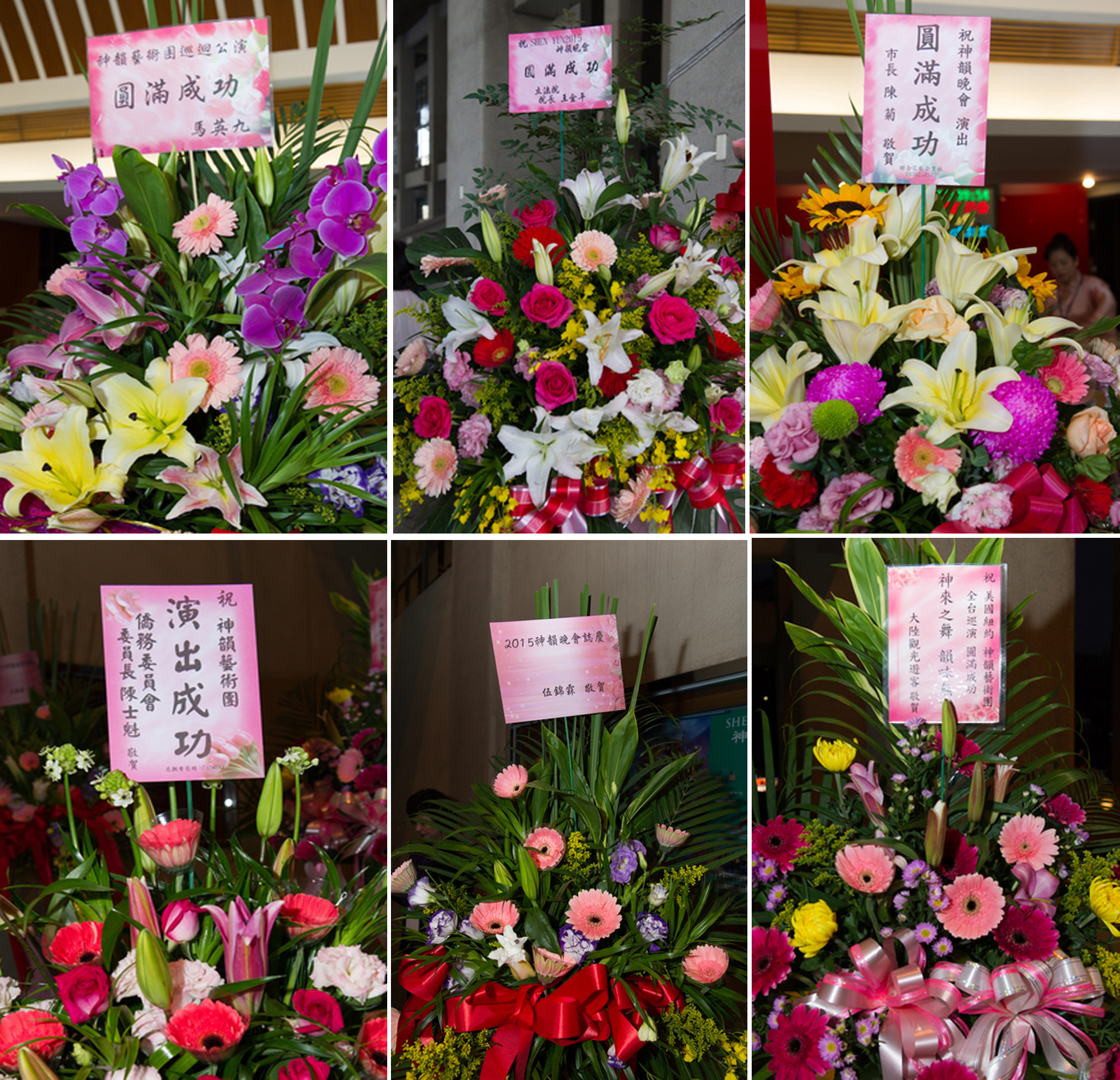 图2:台湾总统马英九和立法院院长王金平、高雄市长陈菊等多位政要致赠花篮,更有大陆游客也送来鲜花祝贺神韵在台湾演出“圆满成功”。